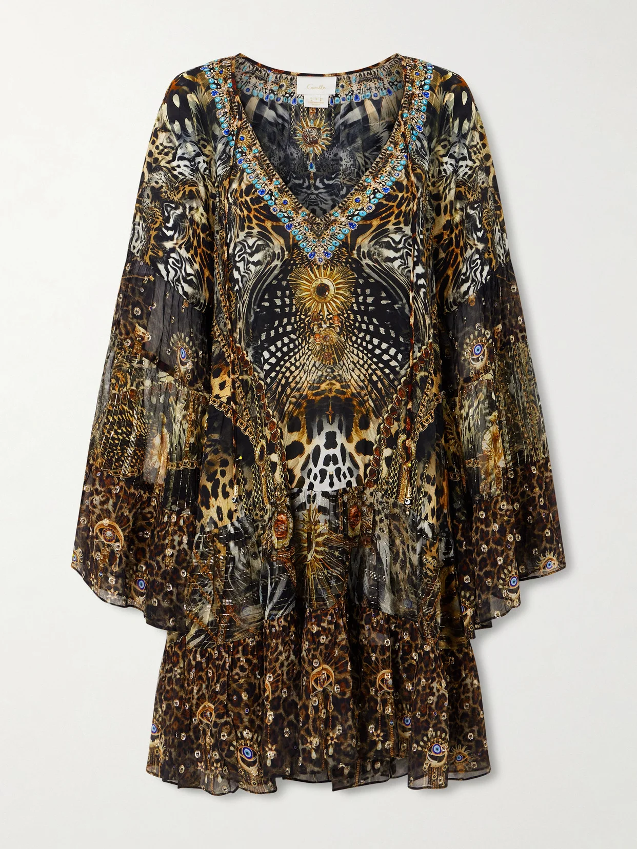 Camilla's dress is printed with the label's 'Feline Folklore' print, rich with prowling cats along with signature jewels and chains. It's cut from lightweight silk crepe de chine with silk-chiffon inserts and fil coupe accents that accentuate the shimmering crystals.