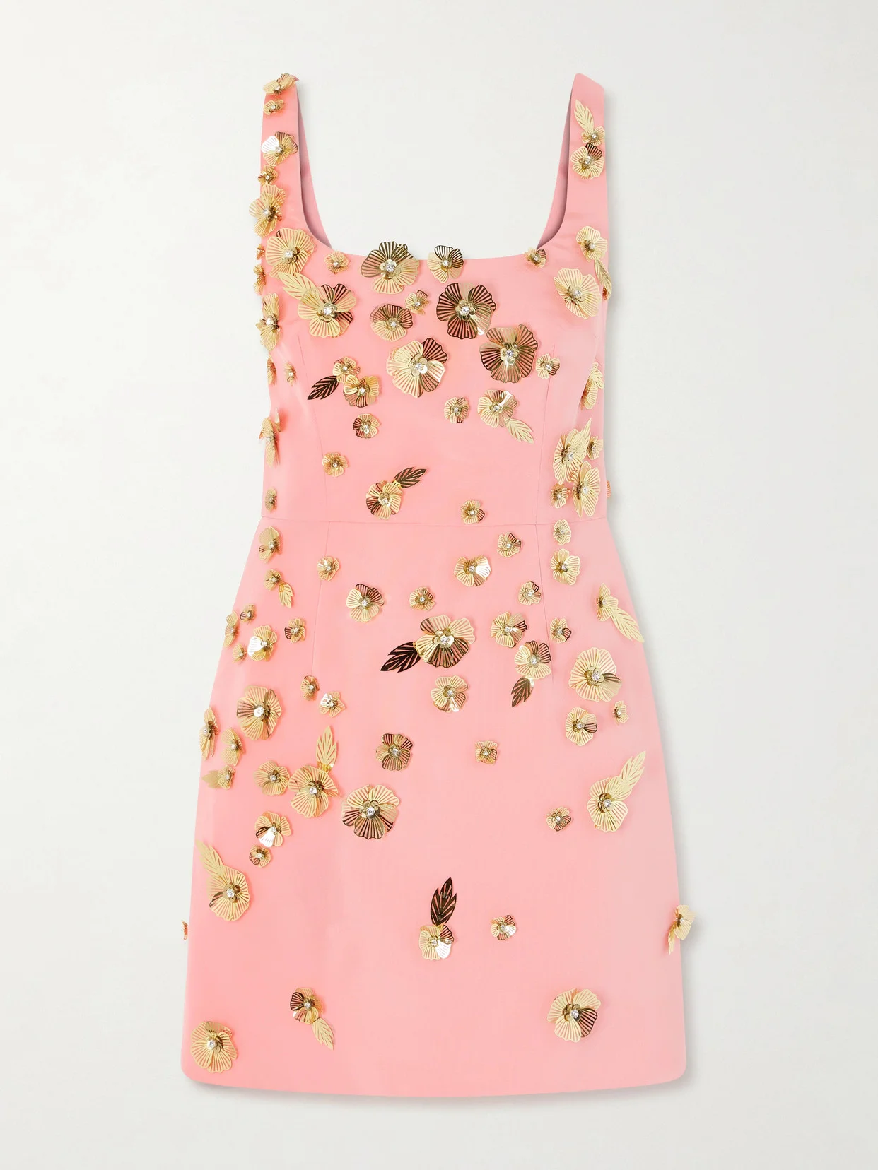 Carolina Herrera's romantic vision is prevalent in this ornate mini dress. Cut from silk-faille, it's adorned with metallic floral embellishments that add texture and shimmer to the streamlined shape. Let it shine with pared-back heels and elegant earrings for weddings, parties or warm-weather soirees.
