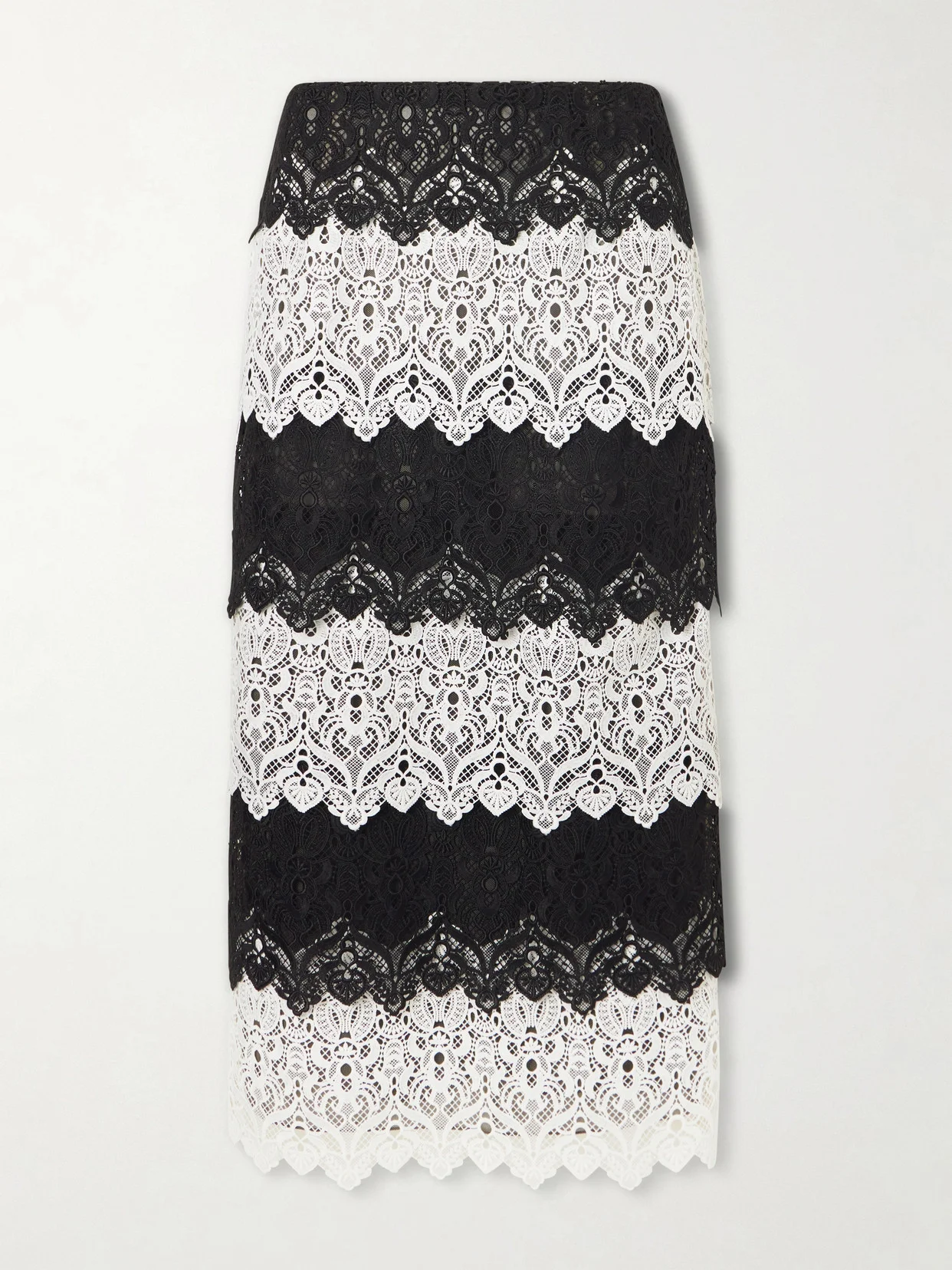 For Spring Summer '26, Carolina Herrera looks to Madrid's "unique approach to beauty". This skirt unfolds in cascading tiers of black-and-white lace that fall from the waist to a fluid midi hem. Style it with tonal accessories so the craftsmanship remains center stage, as seen on the runway.