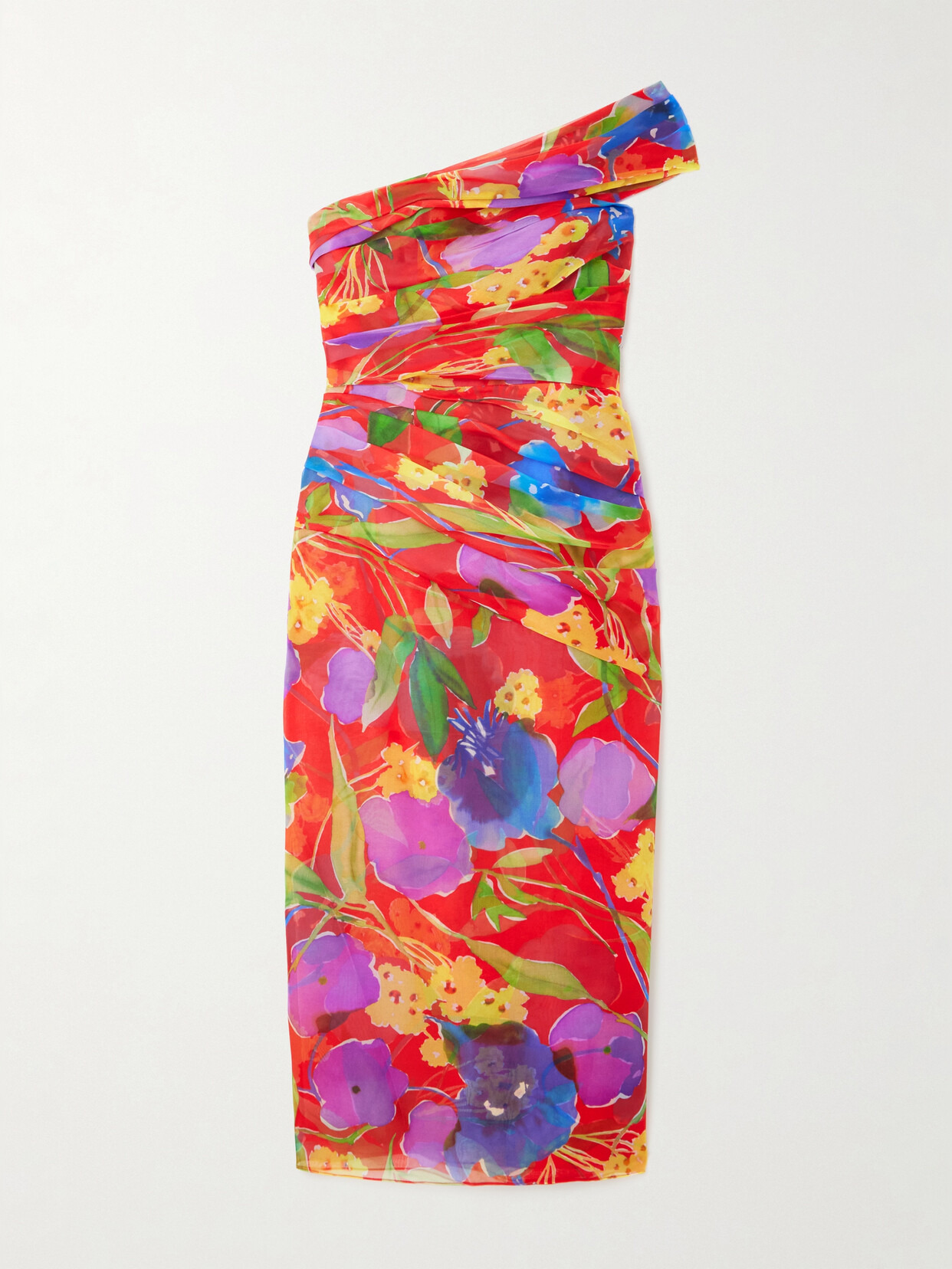 One-shoulder Gathered Floral-print Silk-chiffon Midi Dress