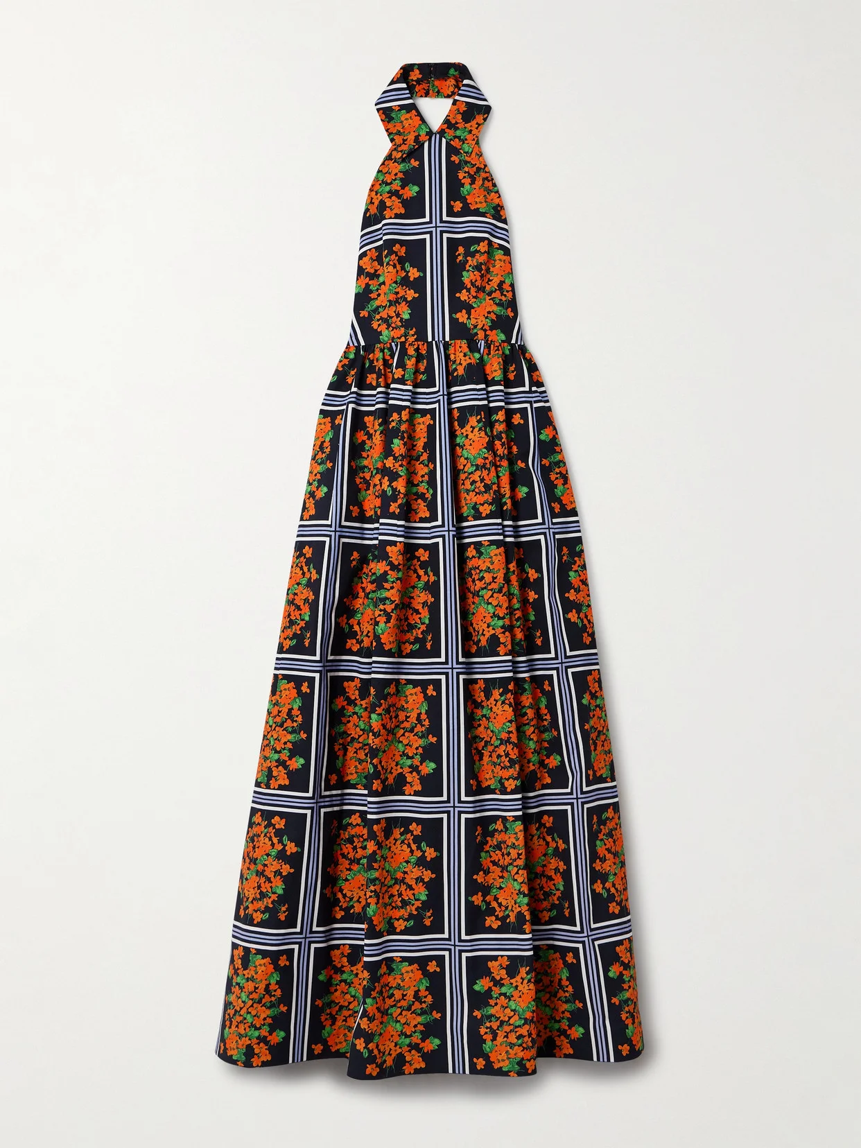 The windowpane floral pattern on Carolina Herrera's gown is inspired by a vintage print from the '50s. Made from faille, it fits close through the bodice before flaring out to a voluminous skirt. Slip your hands into the discreet side pockets.