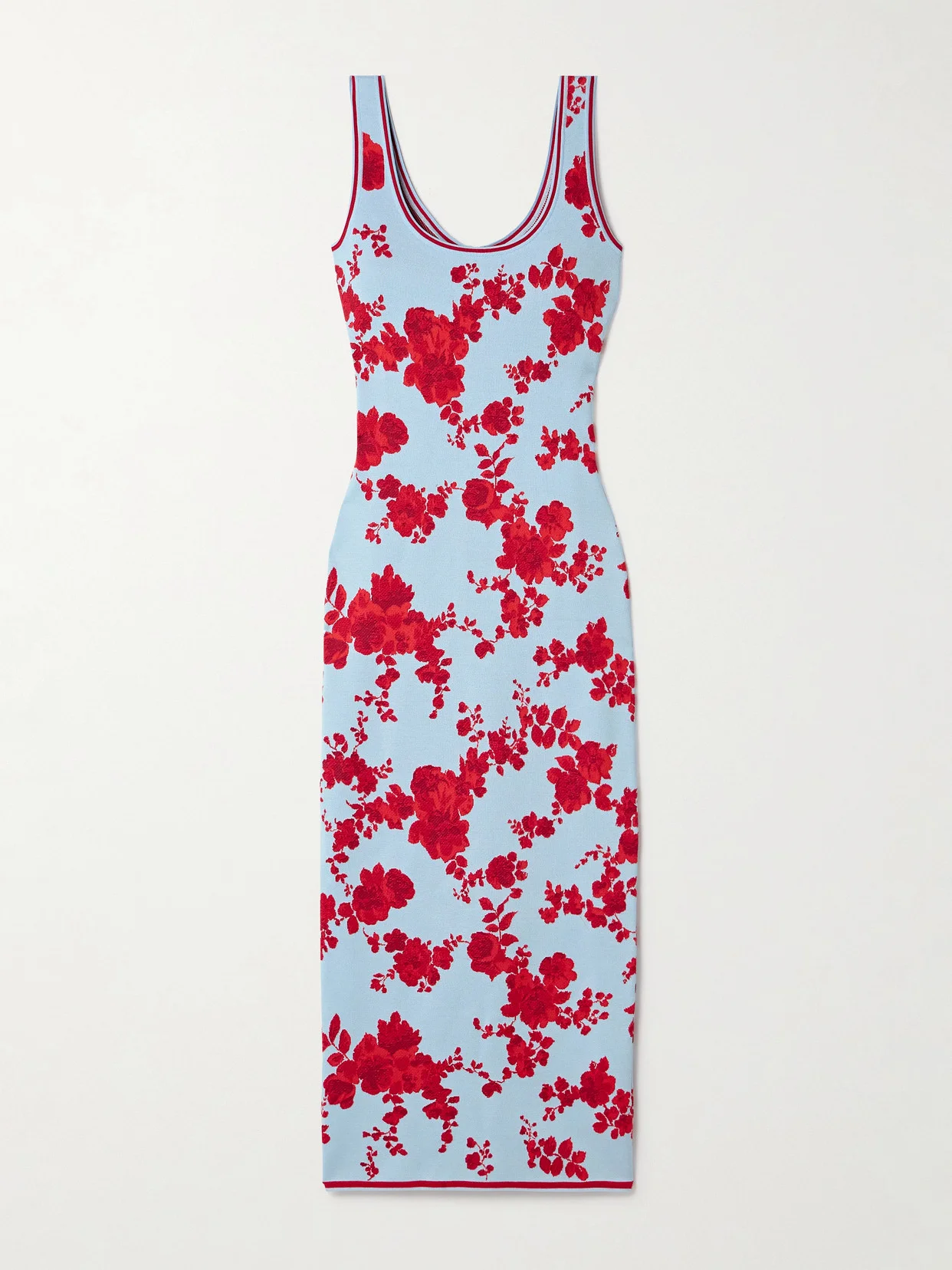 Carolina Herrera's midi dress is jacquard-knitted with clusters of blooming red flowers that pop beautifully against the sky-blue backdrop. It's made from smooth silk that closely hugs your frame.
