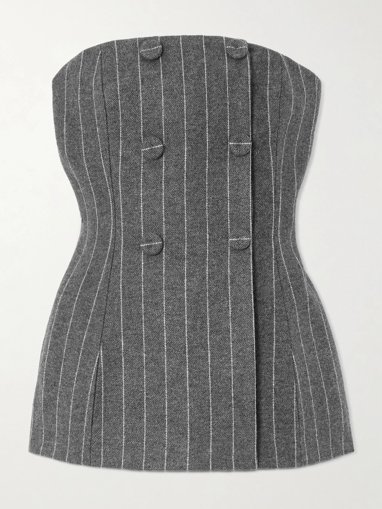 Carolina Herrera's Fall '25 runway championed relaxed tailoring, taking you from the boardroom to cocktail hour with ease. This twill bustier top takes cues from double-breasted blazers, re-invented in a strapless and sleeveless style. It's patterned with chalky pinstripes - a timeless choice.