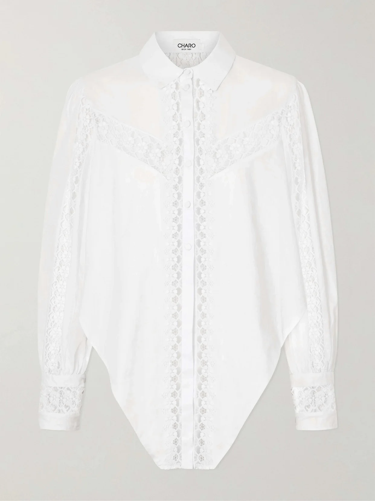 Charo Ruiz updates the classic Oxford shirt through intricate embroidery. Made from cotton-blend voile, the 'Devi' shirt has a dramatic inverted triangle hemline and is designed for a loose fit. Style yours with a mini skirt and kitten heels.