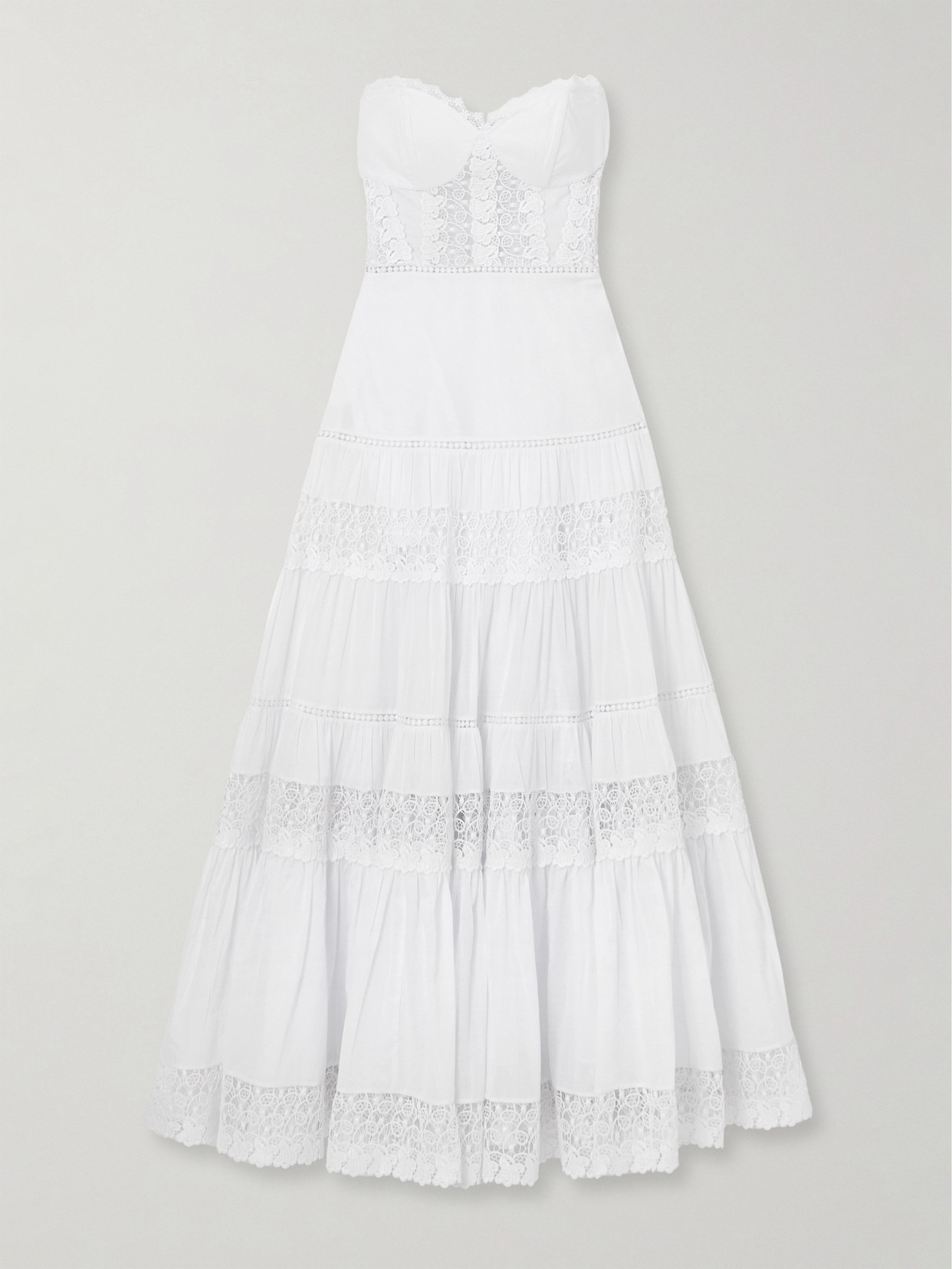 Charo Ruiz's 'Monnet' maxi dress is trimmed with elegant guipure lace depicting an intricate floral motif. Made from white cotton-blend voile, it has a sweeping strapless neckline and tiers of gathers throughout the skirt to emphasize its floaty shape. The shirred back panel ensures a close yet comfortable fit at the bodice.