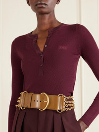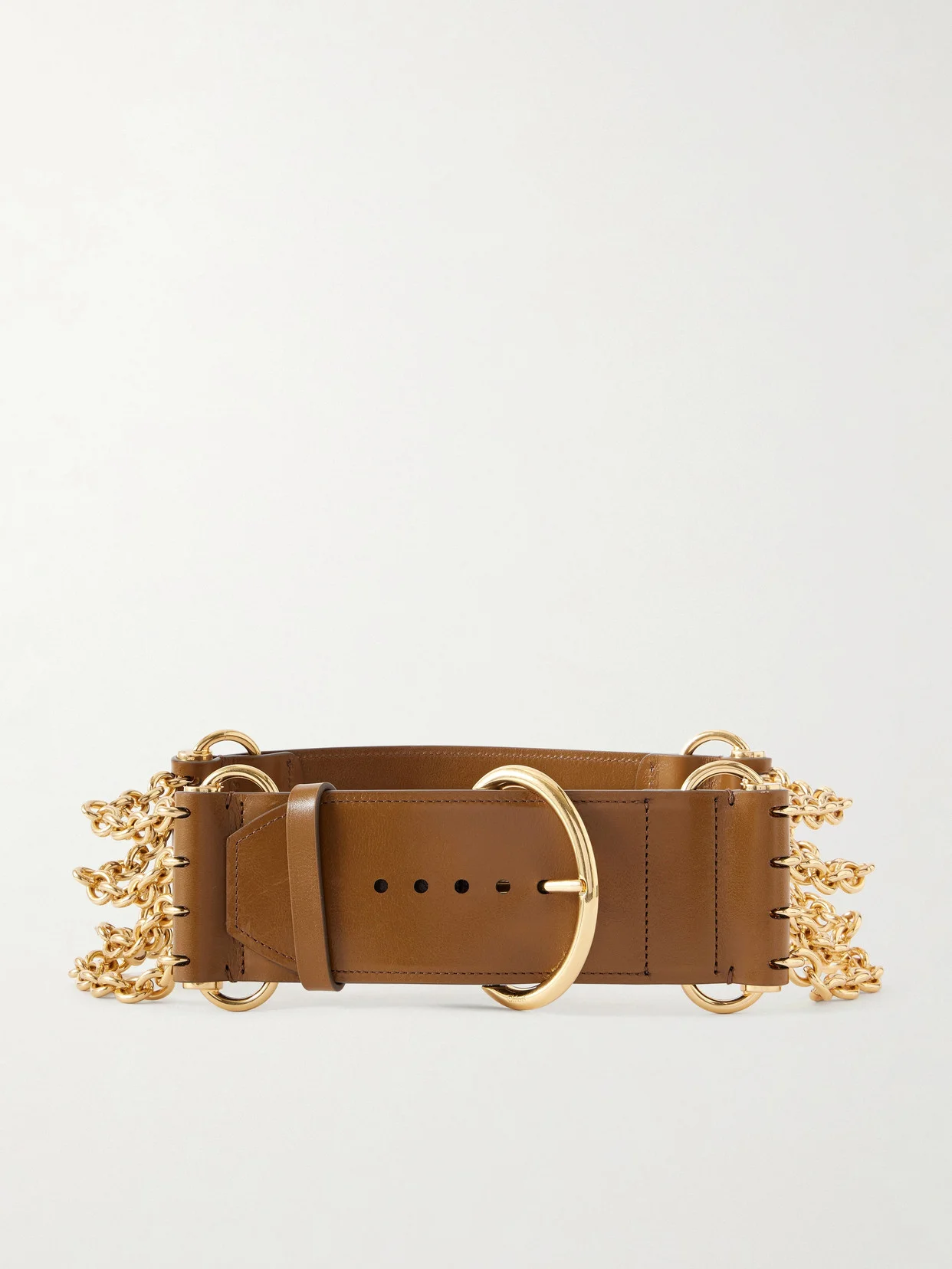 Chloe's belt is designed to make a statement. Crafted from smooth leather, it's punctuated with gold-tone chains along the strap. Wear it over pants or dresses.