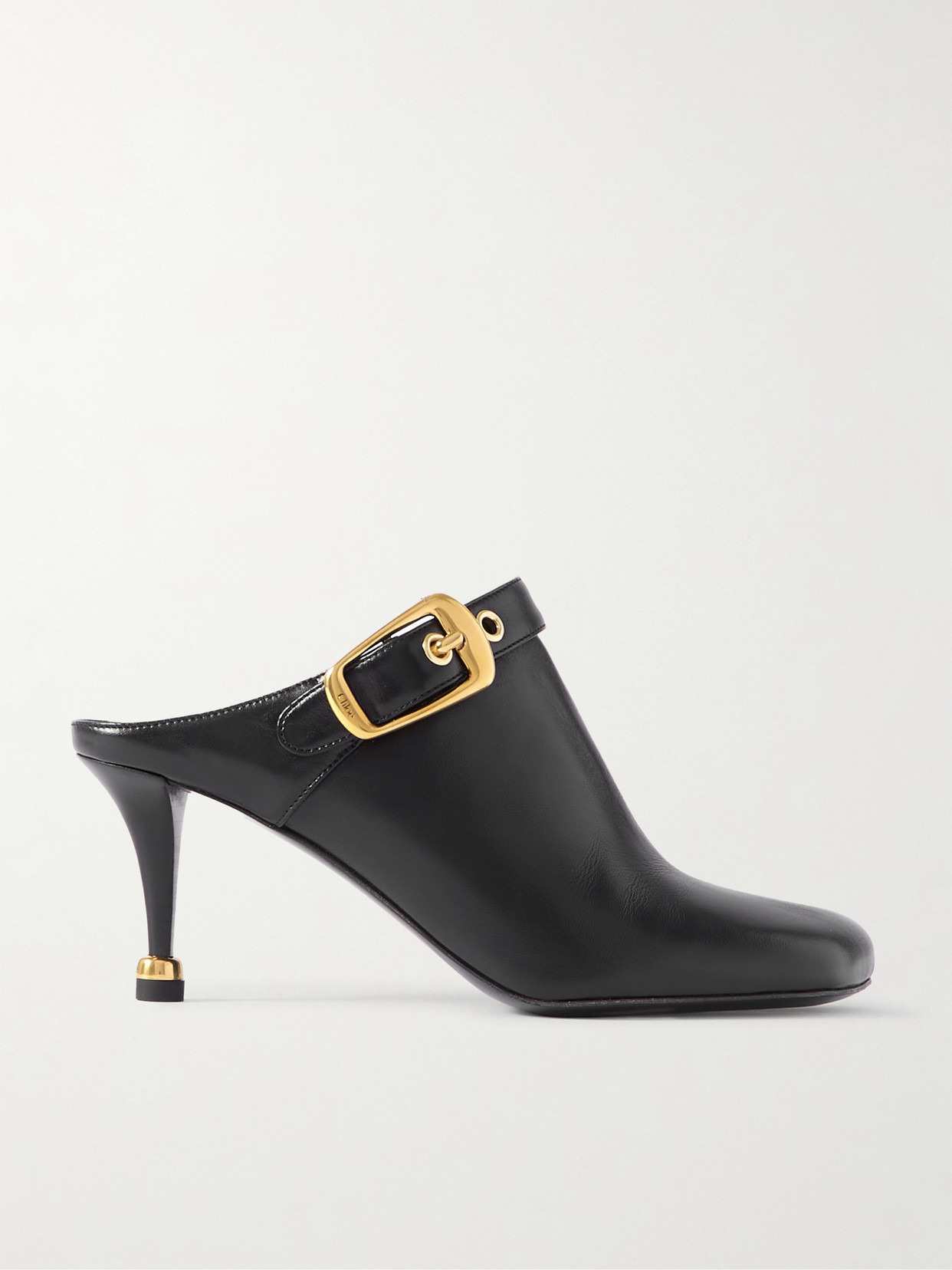 Chloe's 'Andrea' mules are adorned with gold-tone buckles that match the hardware-tipped 75mm heels. They're crafted from smooth leather and have chic square toes.