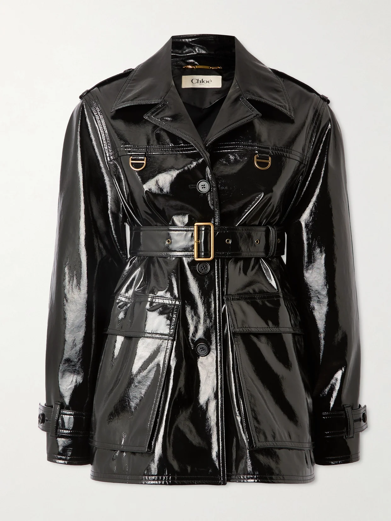 Chloe's jacket blends classic elegance with a modern edge. Made from glossy coated cotton-canvas, it's designed with notch lapels and large flap pockets. Cinch the relaxed shape with the accompanying belt.