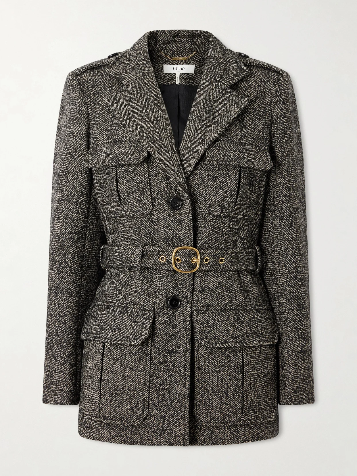 This herringbone jacket illustrates Chloe's polished, bohemian sensibility. Cut from certified wool-blend, it's tailored with flap pockets, strong shoulders and finished with a coordinating belt to draw in the waist. Style yours with slim denim and knee-high boots. Lower-Impact Materials. This product is made using at least 50% lower-impact materials or ingredients. Find out more about our NET SUSTAIN criteria here.