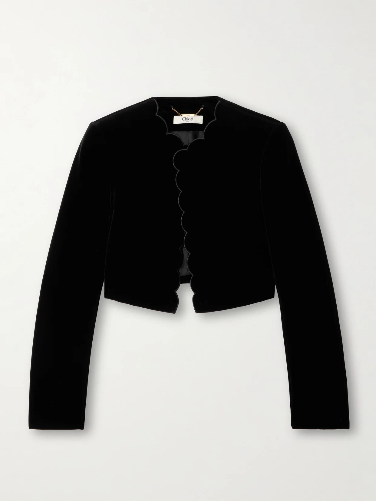 Chloe's jacket is defined by its pretty scalloped edges. It's cut for a slim fit from plush silk-velour and has a cropped hem. Complete the look with a ruffled top and the coordinating skirt in our edit.