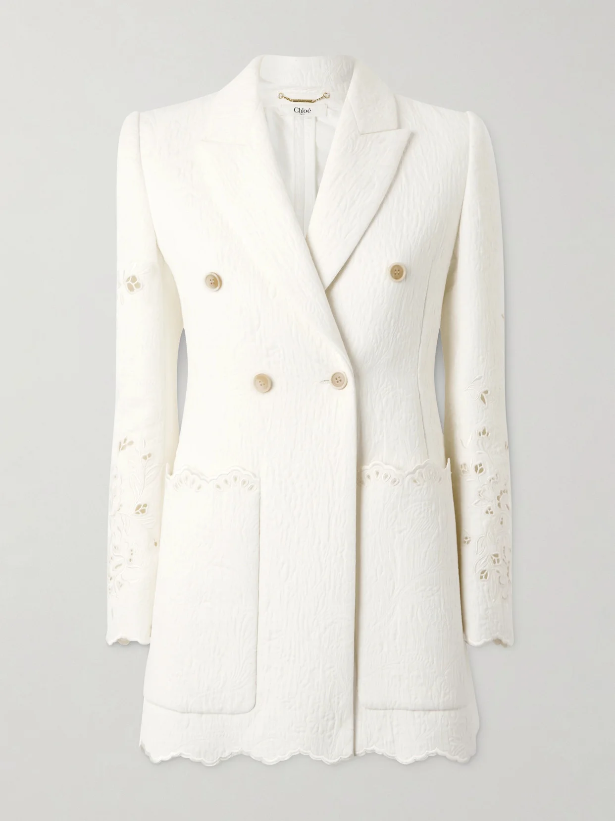Chloe's double-breasted blazer is a bohemian take on power dressing, with its softly scalloped edges and airy broderie anglaise details It's been made in Italy from cotton-blend cloque - look closely, you'll see different types of flowers throughout.