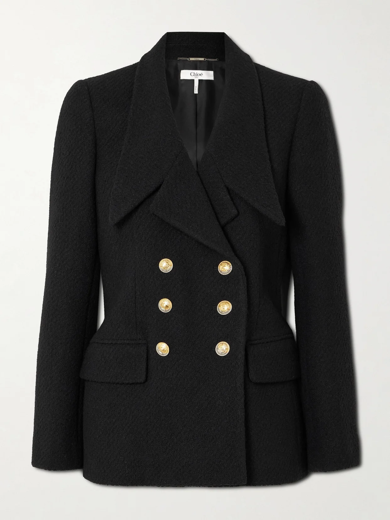 Chloe's double-breasted blazer will look especially smart with the matching mini skirt in our edit. Tailored from wool-blend boucle, it's framed by dramatic peak lapels and fastens with embossed gold-tone buttons.
