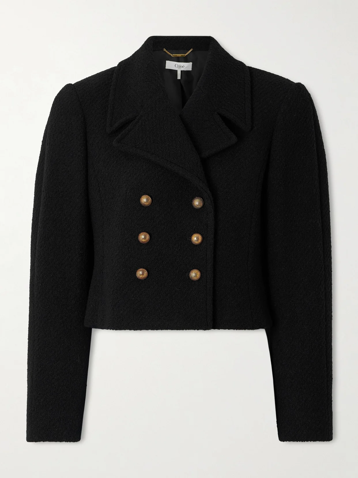 Chloe's wool-blend jacket channels vintage military influences with a feminine twist. Tailored in a boxy, cropped silhouette, it features sharp peak lapels and a double-breasted front detailed with ornate gold-tone buttons. Lower-Impact Materials. This product is made using at least 50% lower-impact materials or ingredients. Find out more about our NET SUSTAIN criteria here.