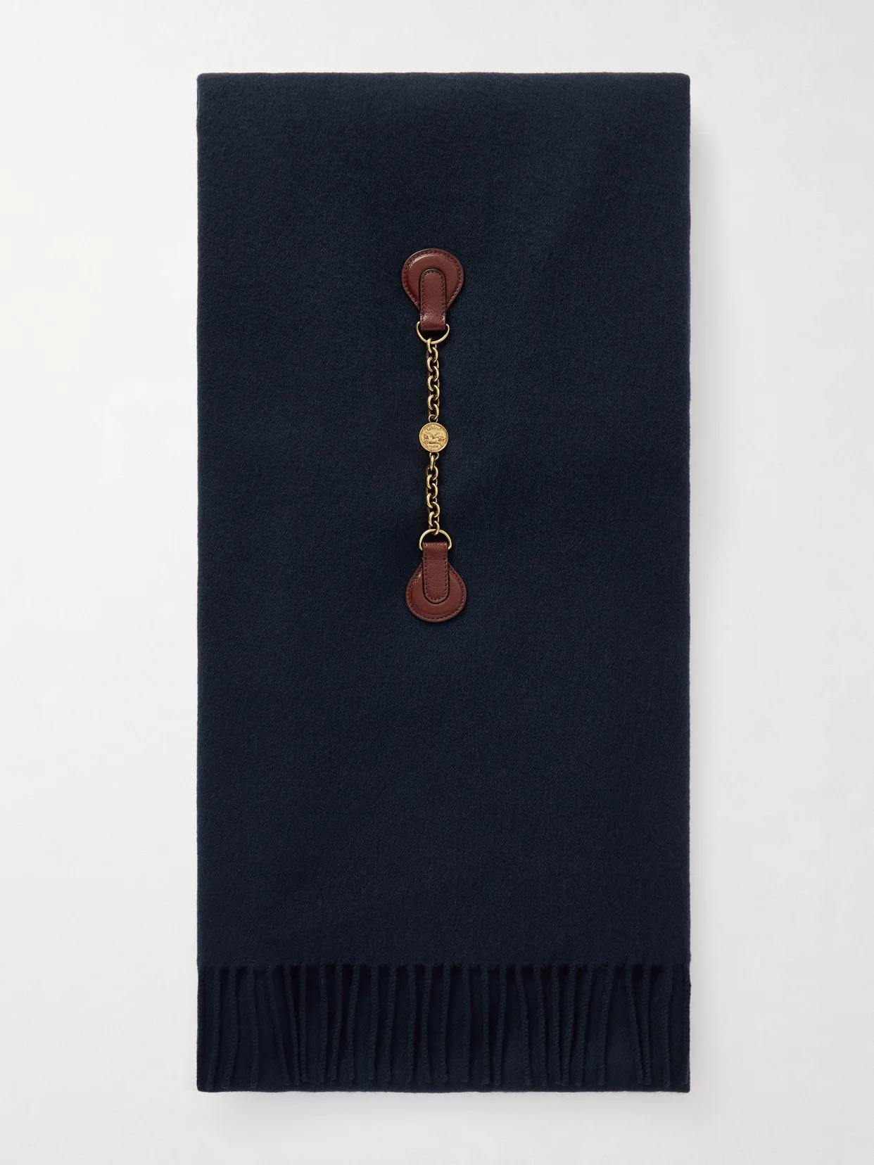 Chloe's scarf is embellished with a gold-tone medallion that features a horse as a nod to the house's equestrian influences. It's made from soft wool with leather trims and fringed ends.