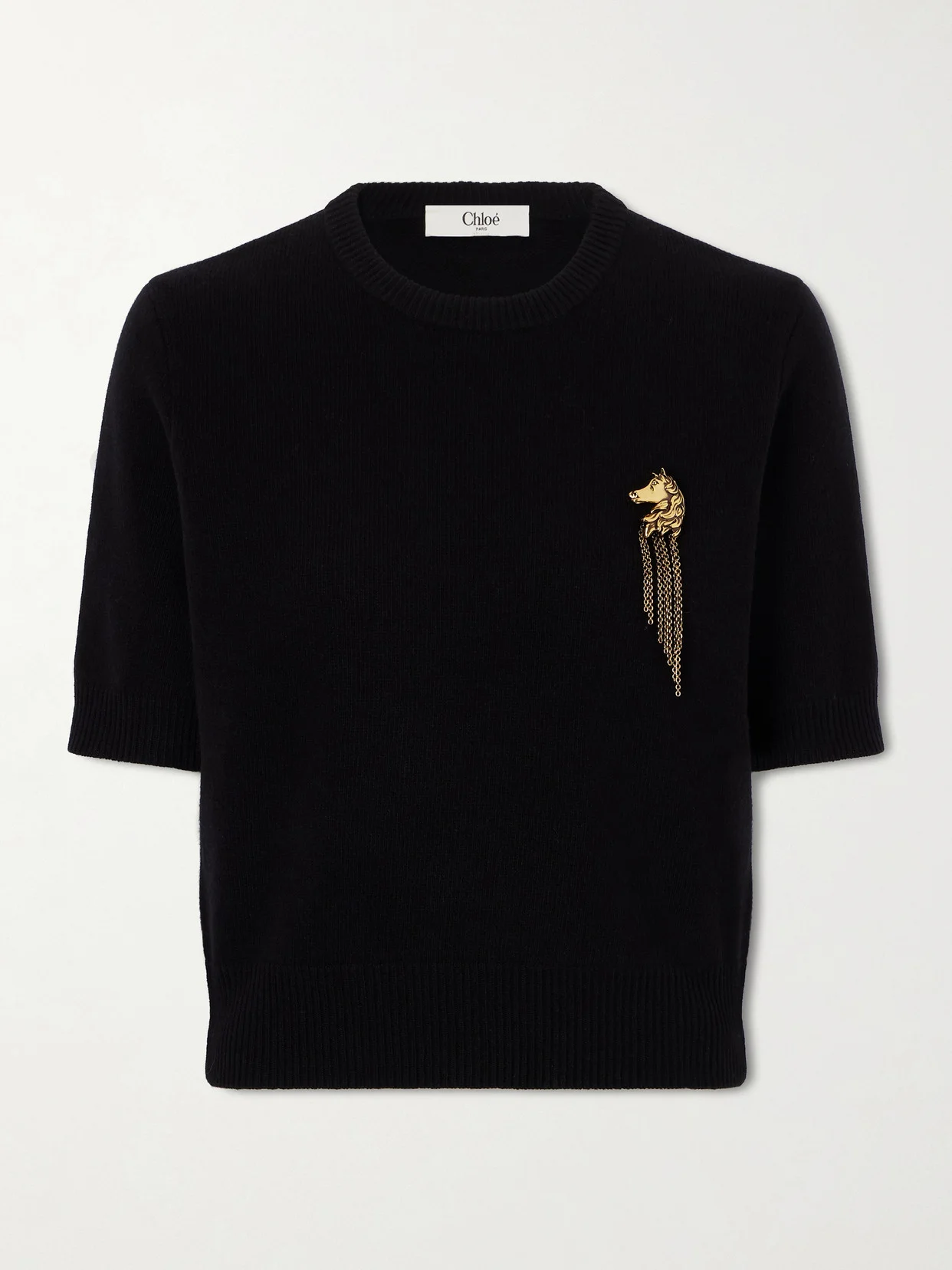 Chloe's sweater is embellished with an equestrian brooch - a longstanding emblem of the free-spirited label and an homage to the Chinese year of the horse. It's rib-knitted from wool with a hint of soft cashmere. Lower-Impact Materials. This product is made using at least 50% lower-impact materials or ingredients. Find out more about our NET SUSTAIN criteria here.