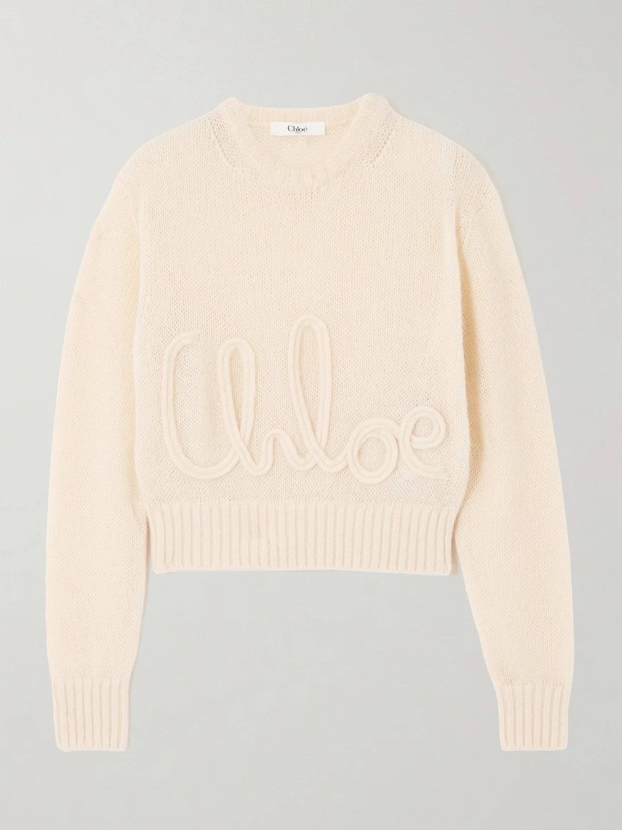 Chloe's sweater is embroidered with a cursive version of the logo. It's knitted from a lightweight blend of alpaca and silk and finished with ribbed trims. Wear yours with the label's jeans.