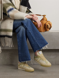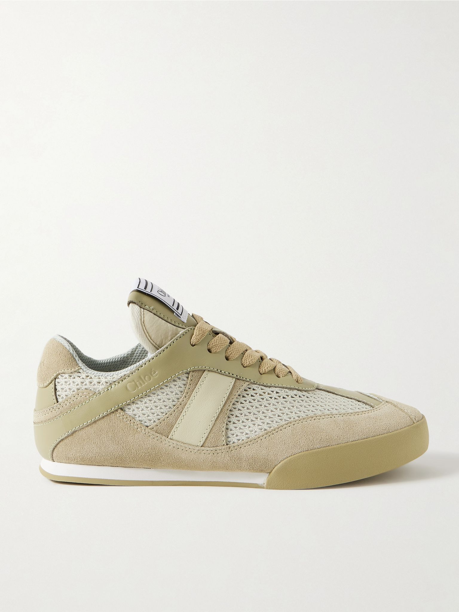 Taking cues from both boxing and ballet shoes, Chloe’s retro ‘Kick’ sneakers have been crafted in Italy from plush suede, breathable mesh and supple leather. They're set on lightweight soles with a discreet wedge for added height and finished with an appliqued logo patch. Size & Fit - Fits true to size, take your normal size - Italian sizing Details & Care - Rubber sole measures approximately 15mm/ 0.5 inches - Army-green leather, beige suede, cream mesh - Lace-up front