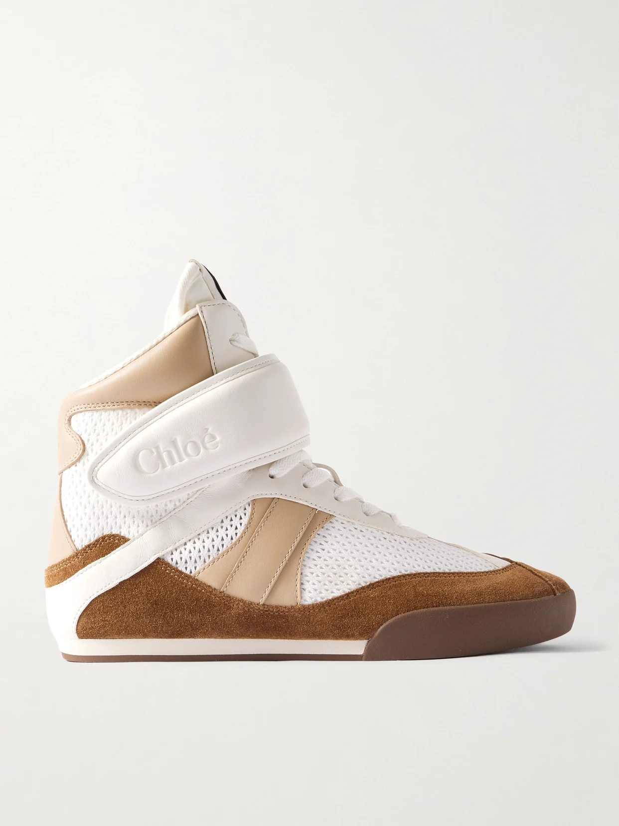 A cool re-interpretation of boxing shoes and retro ‘90s high-tops, Chloe's ‘Kick' sneakers blend athletic design with refined craftsmanship. They're made from panels of suede, mesh and leather and have wide Velcro® straps embossed with the logo.