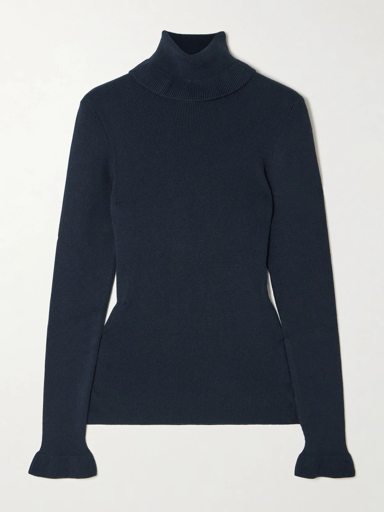 Chloe's sweater is rib-knitted from cotton and wool-blend in a slim fit, with frilled cuffs and a face-framing turtleneck. A gold-tone embossed plate at the back indicates the artistry behind the design.