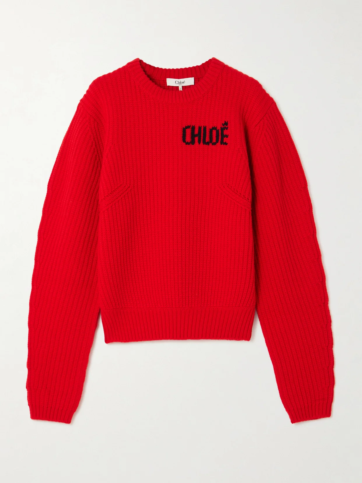 The vibrant red on Chloe's sweater will make it a standout addition to your knitwear edit. It's rib-knitted from a cozy wool and cashmere-blend and designed for a relaxed shape enhanced with dropped shoulders. Fans of the label will love the bold intarsia logo across the chest. Lower-Impact Materials. This product is made using at least 50% lower-impact materials or ingredients. Find out more about our NET SUSTAIN criteria here.