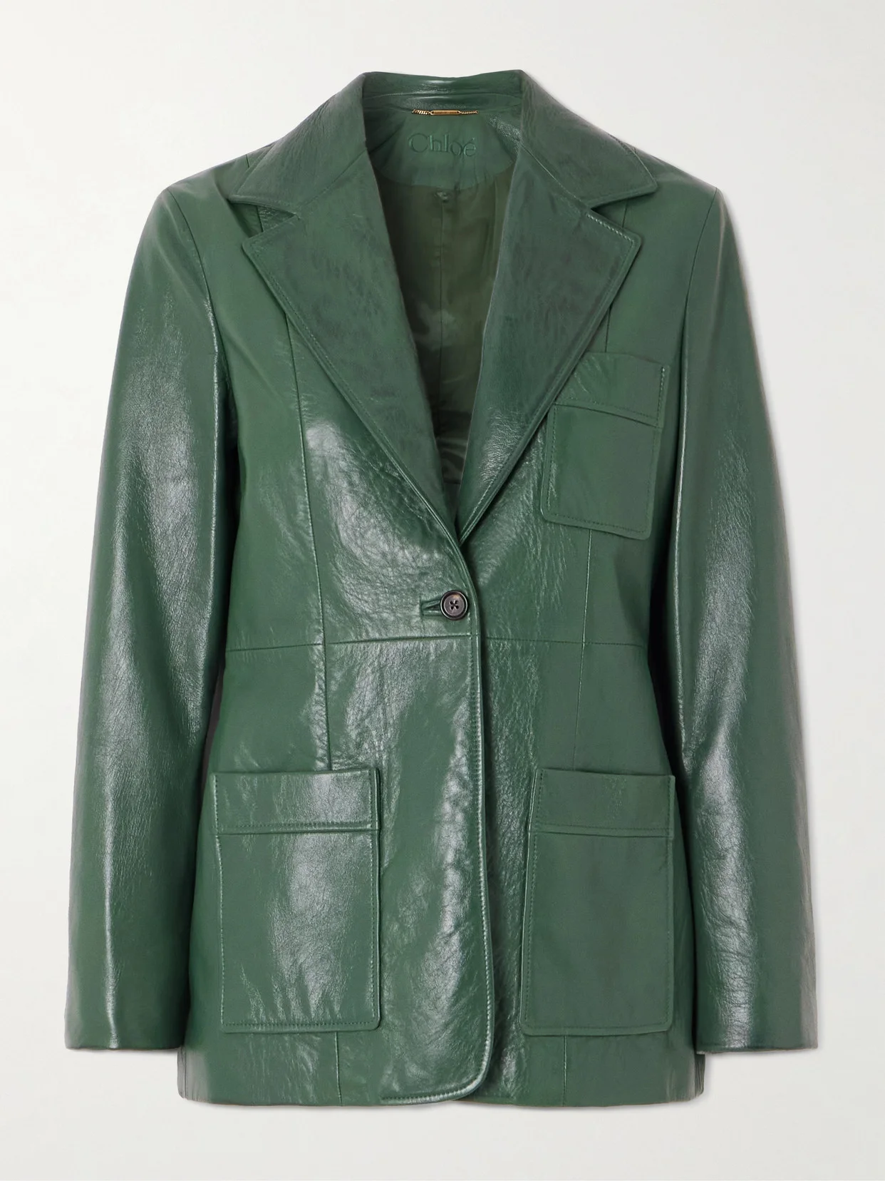 A chic and versatile staple you'll wear for seasons to come, Chloe's jacket captures polished Parisian style with a modern edge. It's made from panels of green leather for a slim fit and has sharp notch lapels and padded shoulders. Lower-Impact Materials. This product is made using at least 50% lower-impact materials or ingredients. Find out more about our NET SUSTAIN criteria here.