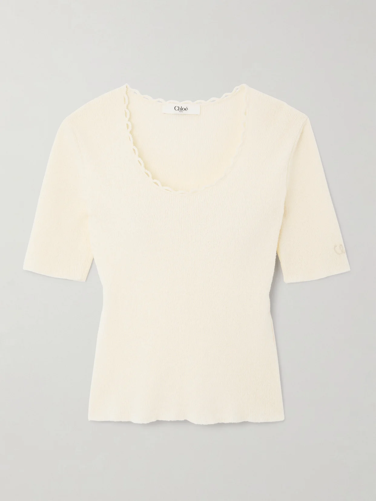Chloe's T-shirt is detailed with picot trims along the scooped neckline, adding an element of femininity. It's made from cotton-blend boucle with a ribbed finish to accentuate your curves and has a close yet flexible fit. Tuck yours into tonal shorts or the label's floaty skirts.