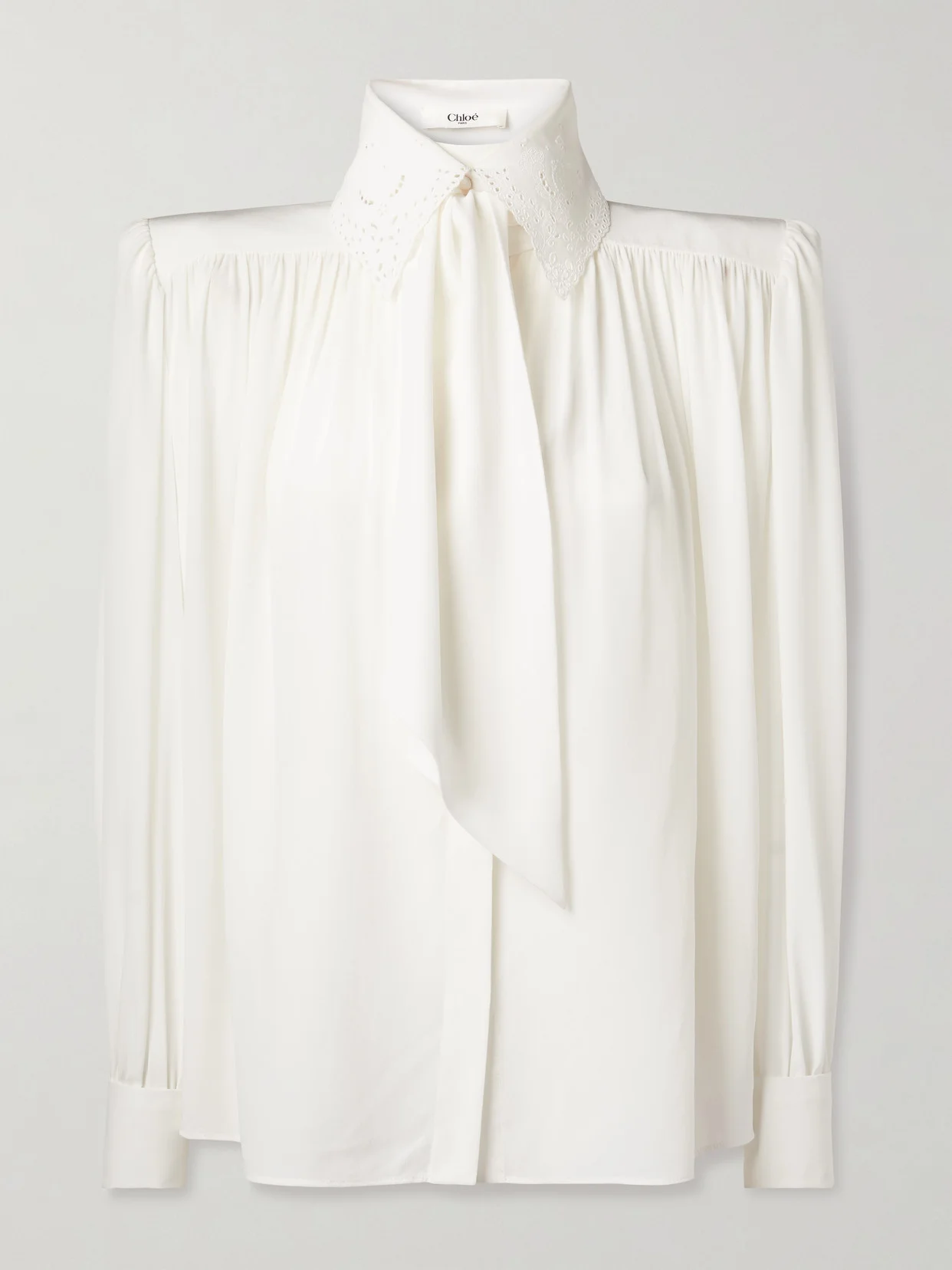 Pussy-bow Broderie Anglaise-trimmed Gathered Organic Silk Shirt