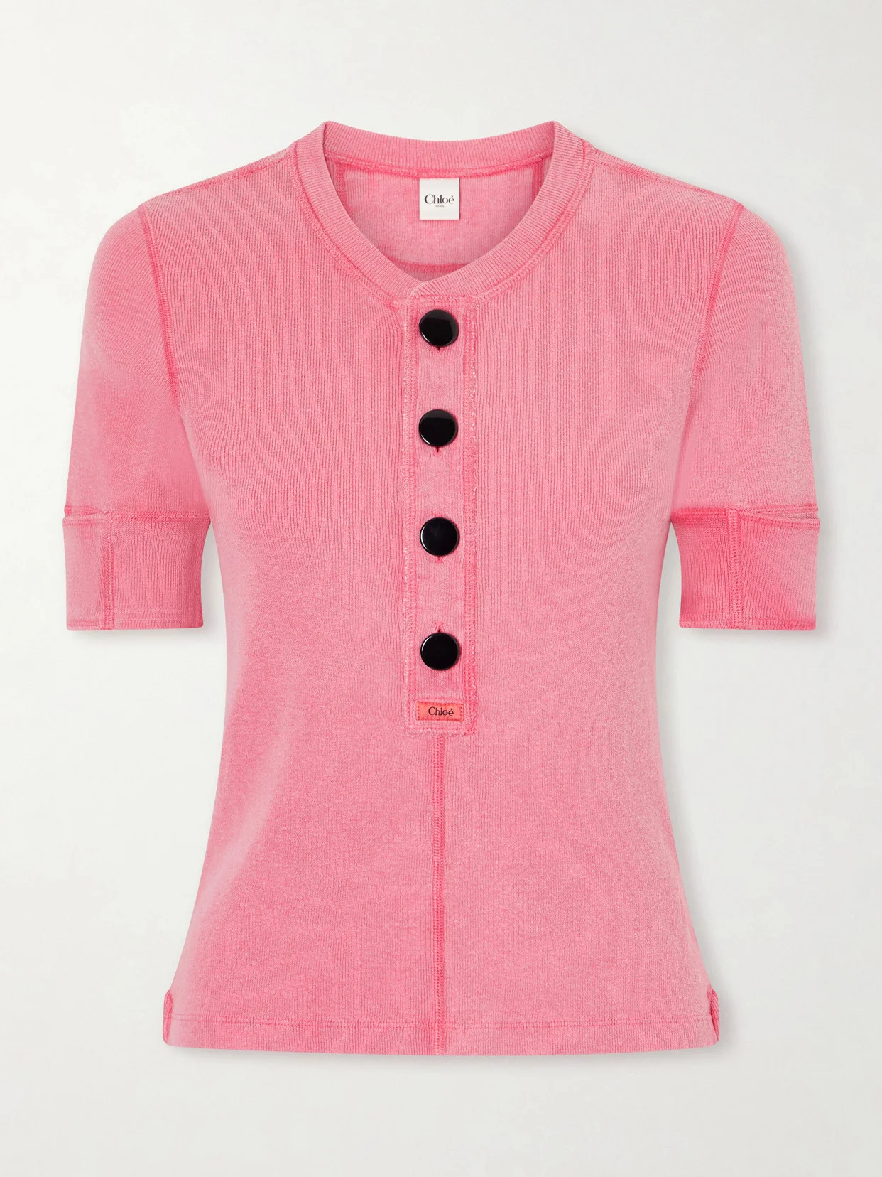 Chloe's tee will add a pop of colour to any outfit. It's made from pink cotton-jersey and stitched with black buttons at the front. The faded finish and ribbed texture lends a vintage feel.