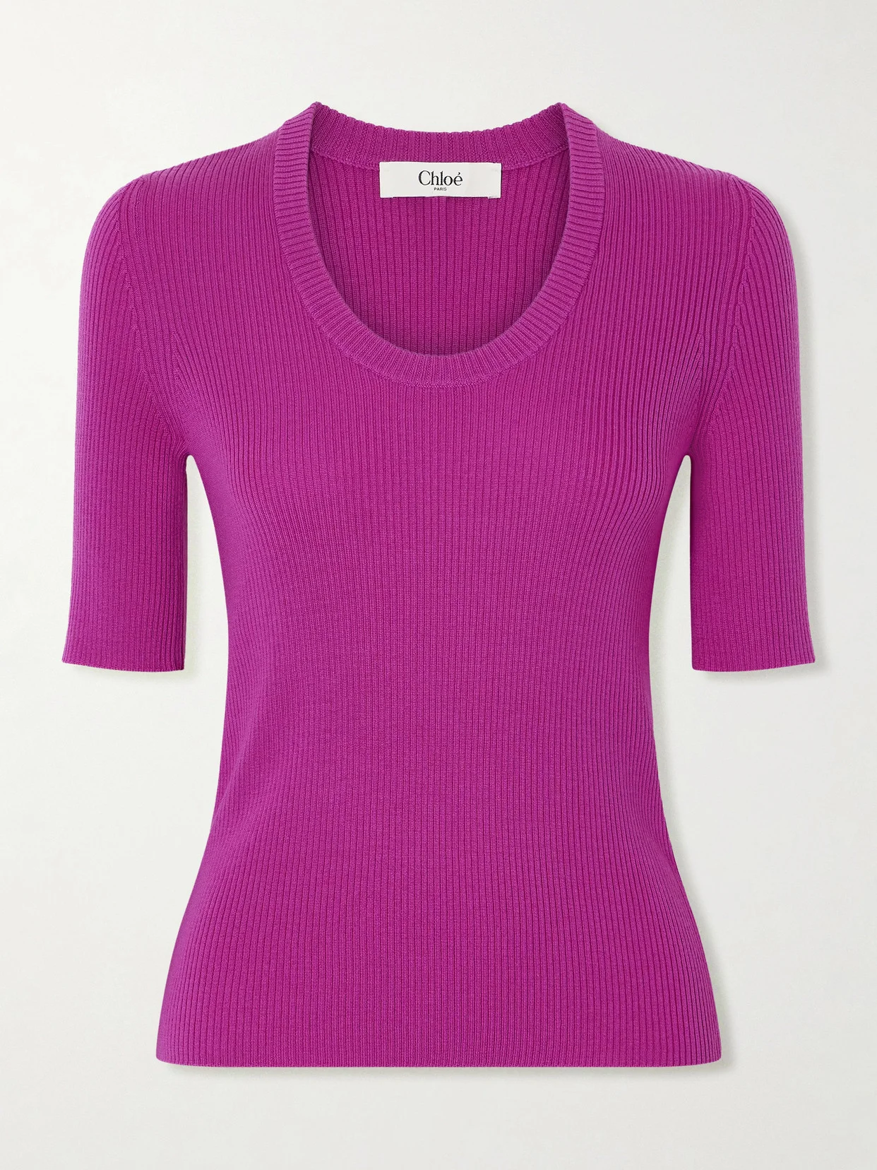 The short sleeves of Chloe's top create endless layering options. With an elegant scoop neck, it's knitted from wool and ribbed for a close fit. Lower-Impact Materials. This product is made using at least 50% lower-impact materials or ingredients. Find out more about our NET SUSTAIN criteria here.