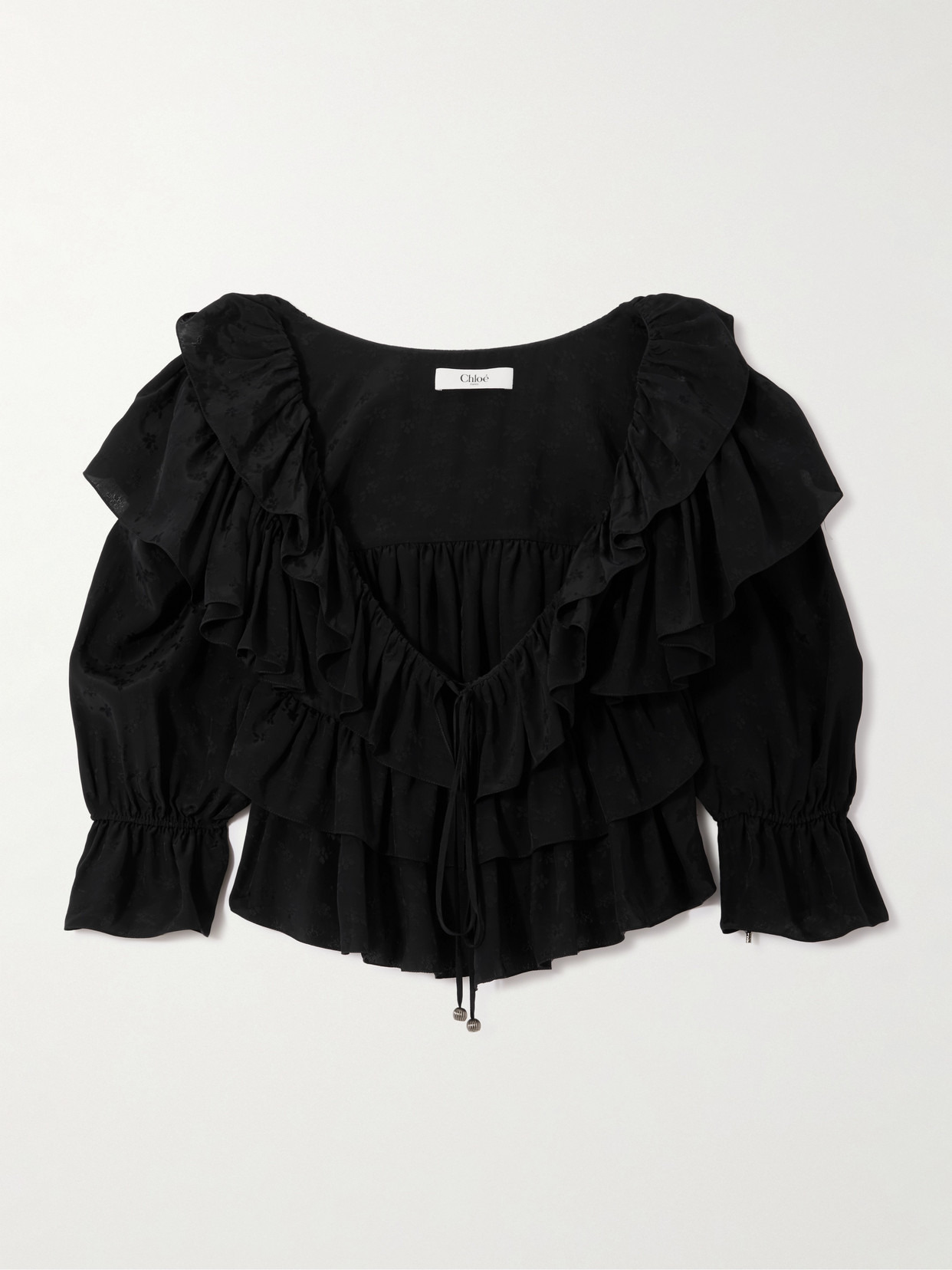 Chloe has perfected the art of designing elevated bohemian designs. This blouse is made from lightweight jacquard that's subtly woven with tiny flowers and has tiers of flouncy ruffles that create beautiful movement throughout. The metal-tipped ties adjust the open front and cuffs.