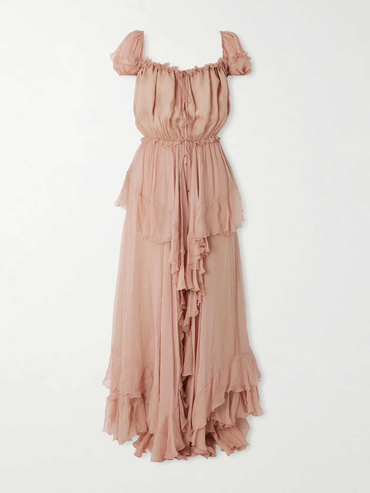 Chloe's gown is a testament to the maison's free-spirited femininity. Made from silk-mousseline, it has a sweetheart neckline framed by fluttery sleeves and falls in tiers to a hankerchief hem. Gold jewelry will complement the pretty blush shade. Lower-Impact Materials. This product is made using at least 50% lower-impact materials or ingredients. Find out more about our NET SUSTAIN criteria here.