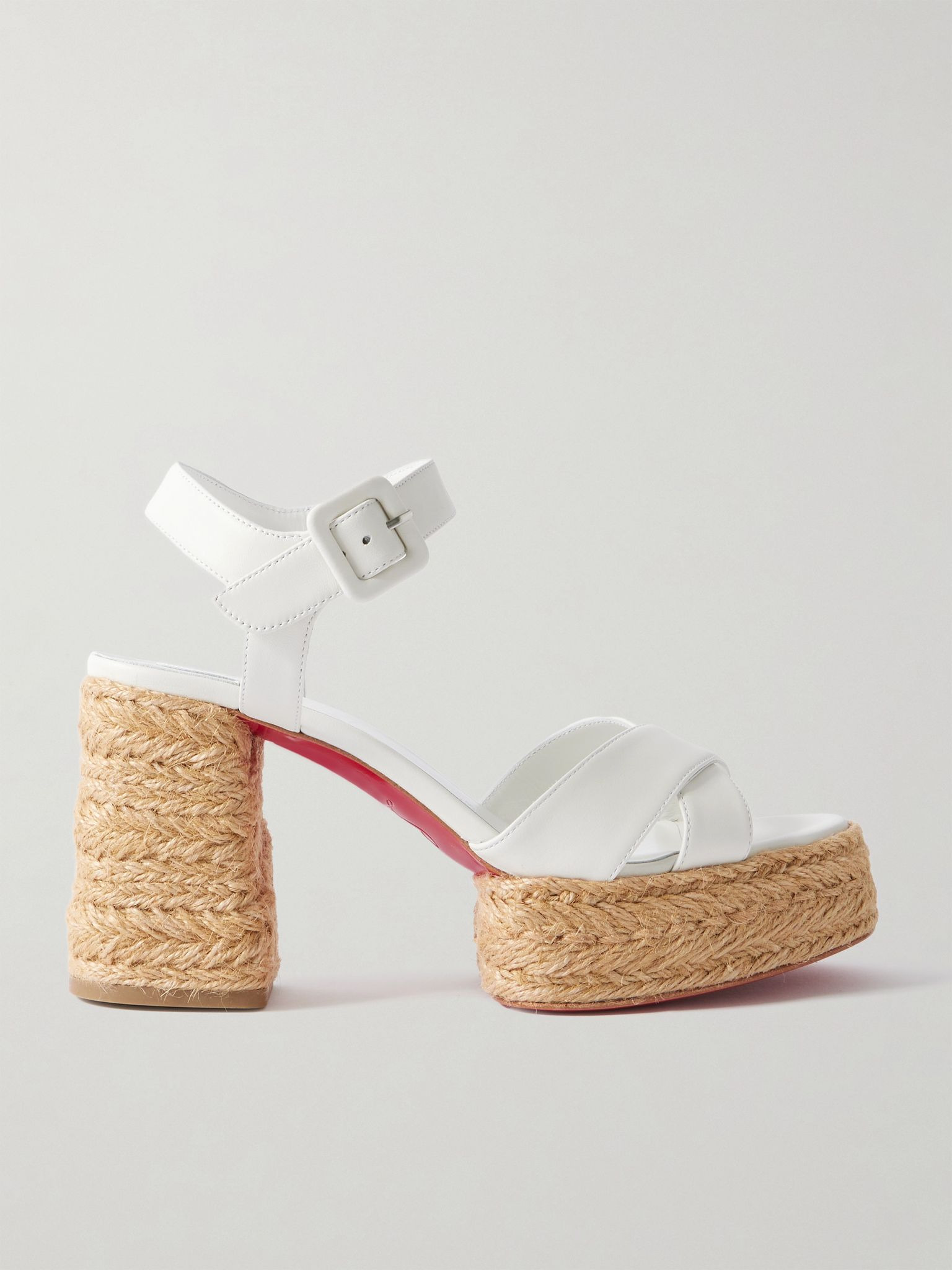 Christian Louboutin's 'Calakala' sandals have classic espadrille soles with a little lift. They have crossover straps made from white leather and fasten with adjustable buckles. Wear yours with summer dresses, cropped pants and everything in between. Size & Fit - Fits true to size, take your normal size - Only available in full sizes, go down to the nearest whole size if you take a half size Details & Care - Heel measures approximately 85mm/ 3.5 inches - White leather - Buckle-fastening ankle strap