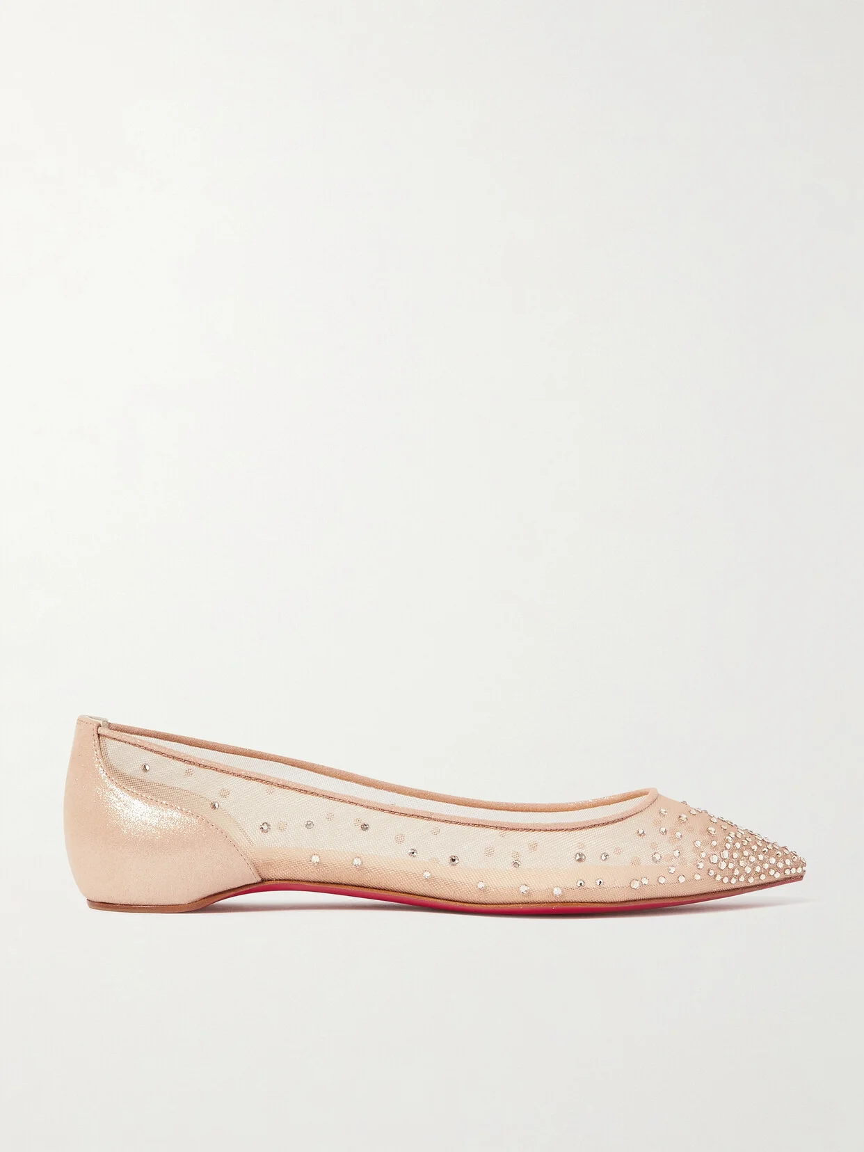 Christian Louboutin's 'Follies' shoes prove that even if you opt out of wearing heels to an event, flats can feel just as special. Trimmed with tonal suede piping, they're made from beige mesh and shimmering lame and have a pointed toe encrusted with Swarovski crystals. The designer's signature lacquered red sole is revealed with every step.