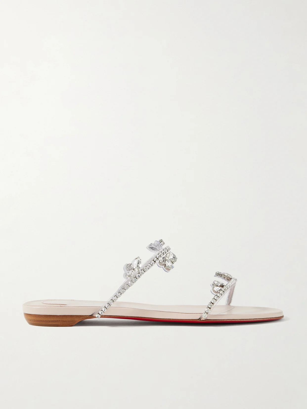 Christian Louboutin's 'Just Queenie' sandals are embellished with sparkling crystals that trace the slim straps and are also arranged in small clusters, creating the illusion that they're floating over your arch. They've been made in Italy from clear PVC and have slight wooden heels.