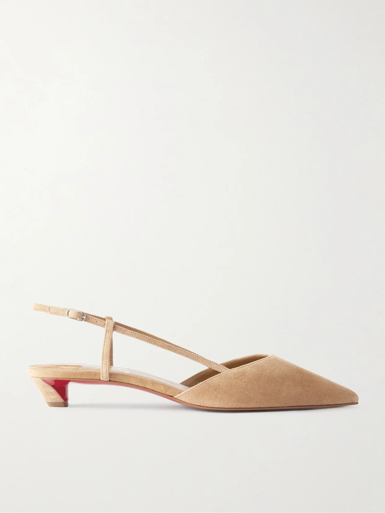 Christian Louboutin's pumps belong to the new 'Miss Z' collection, which embodies the modern spirit of the 2020s and features the new 'Eternal Red Sole' - an innovative and resistant coated base. They're crafted from beige suede with classic pointed toes and angular kitten heels.