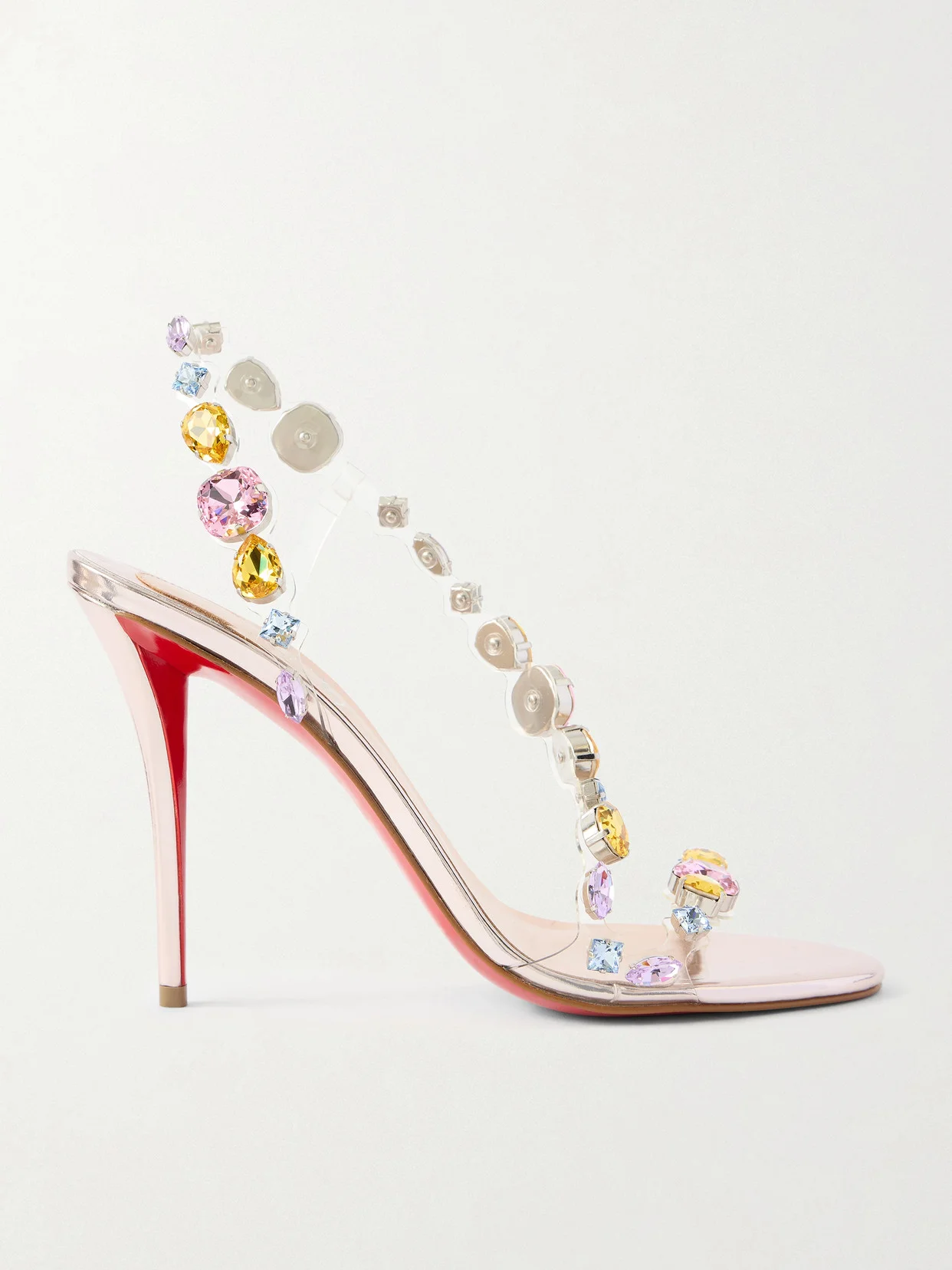 Christian Louboutin's 'Rosa Z Jewel' sandals have clear straps adorned with dazzling crystals that appear as if they're floating. They've been crafted in Italy from PVC and rest on stiletto heels that offer 100mm of towering lift. The red lacquered soles are instantly recognizable.