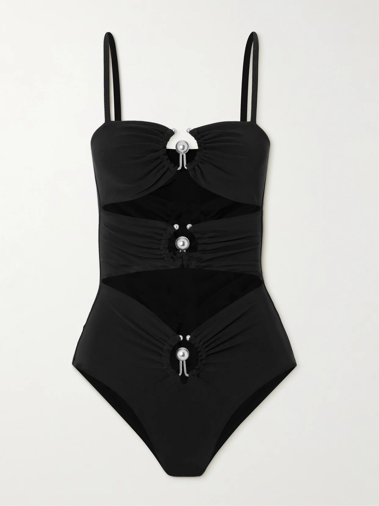 Much like the designer's ready-to-wear collections, Christopher Esber's swimsuit is defined by chic, architectural elements. It's made from black stretch fabric and has diamond-shaped cutouts threaded with silver-tone rings.