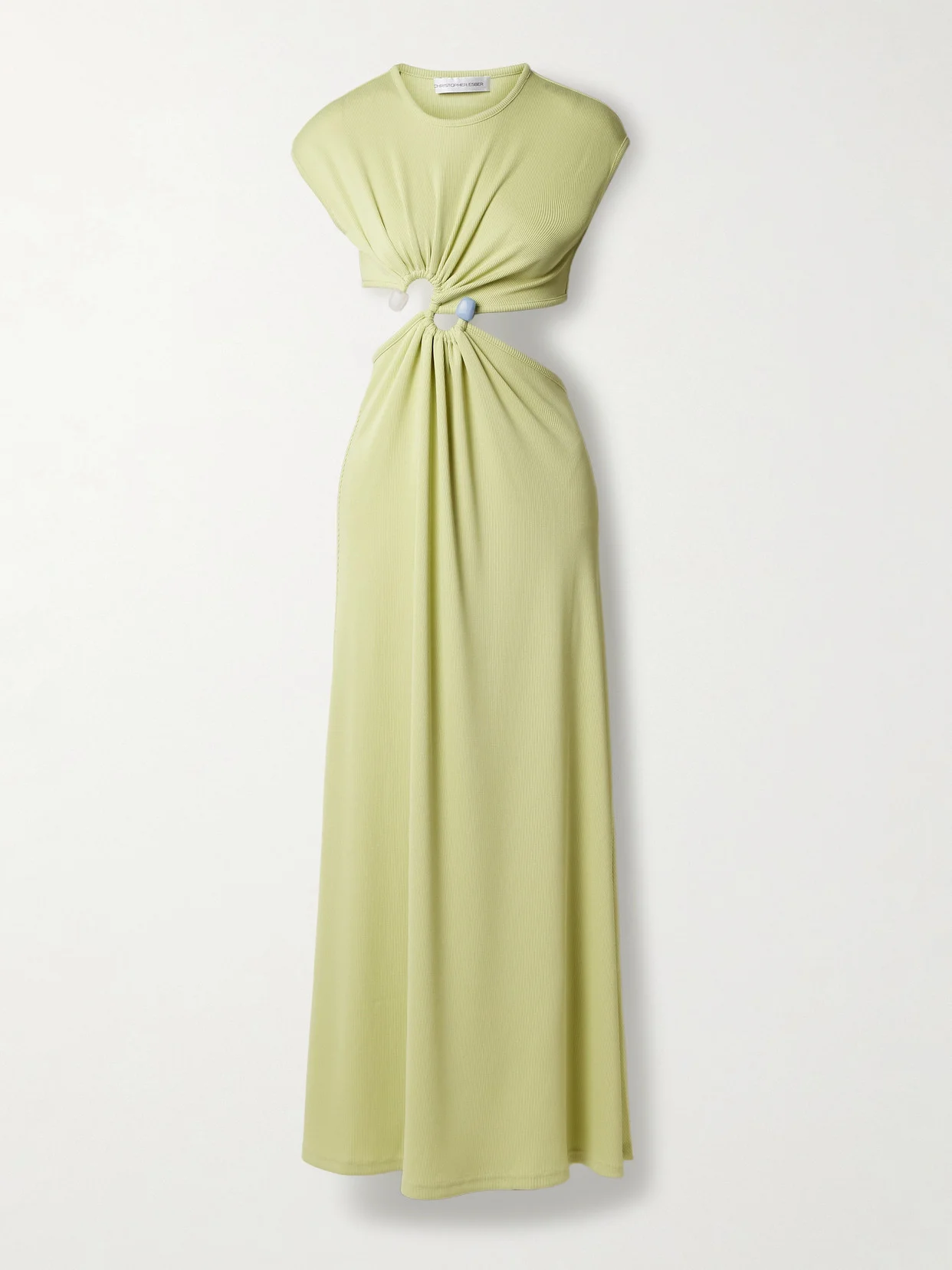 Christopher Esber's dress features S-shaped hardware at the cutout bodice, which is tipped with a smooth stone on either end. It's made from 'Melon' ribbed-knit and falls to an ankle-grazing maxi hem. Accessorize with sandals and a mini bag.