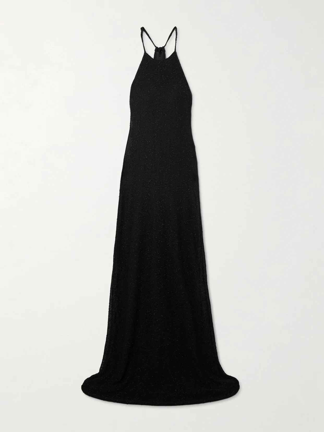 Christopher Esber's designs are about unique form and modern sensuality. This 'Imber' dress is made knitted with metallic threads to skim the figure and has a deep racerback, which feels quite contemporary. The slim ties can be knotted at the nape or in front of the neck.