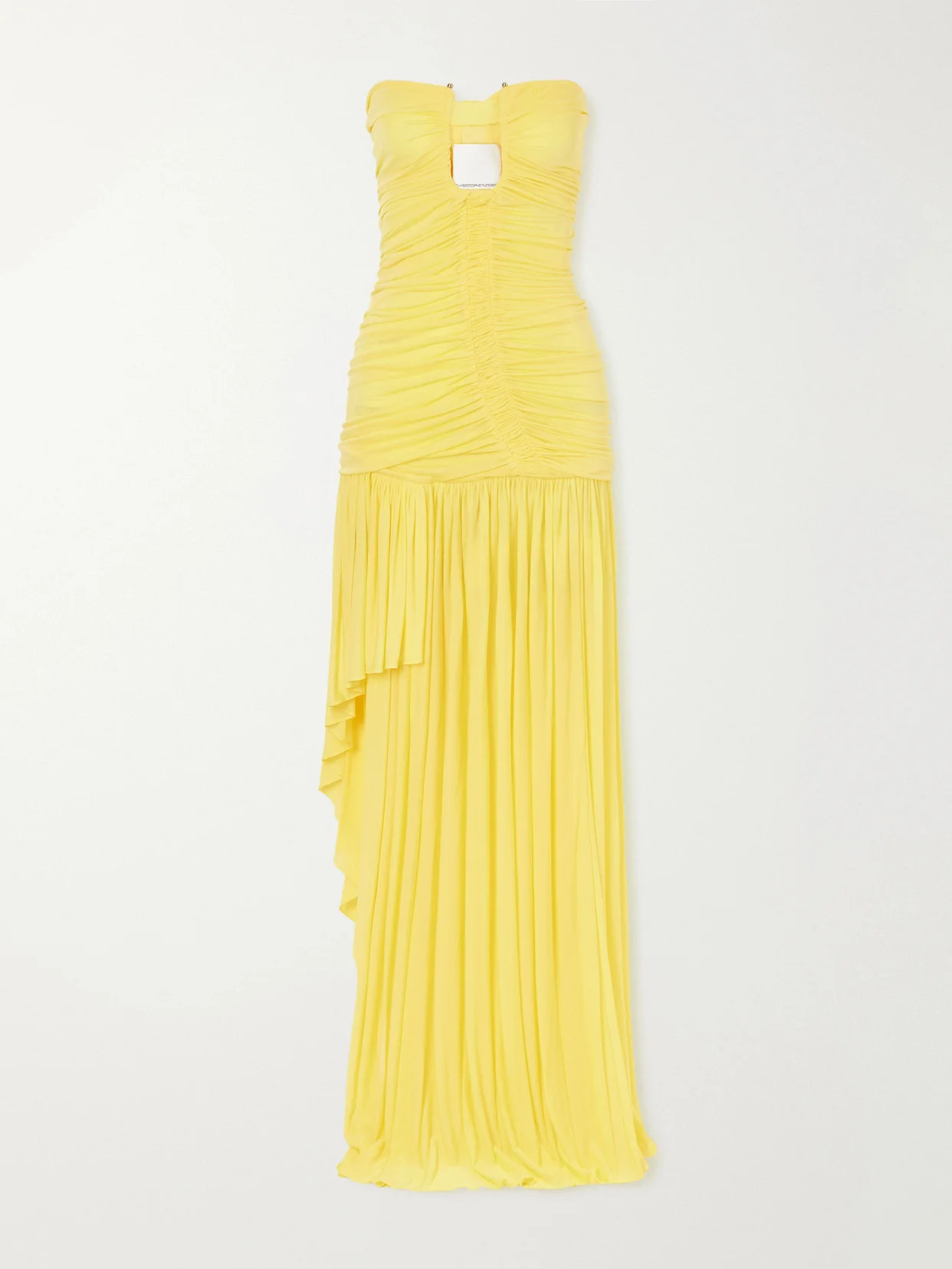 Christopher Esber's ‘Orion' dress feels artful in its precision, defined by a strapless silhouette and a sculptural, curved neckline. Directional ruching sculpts the bodice through the waist before releasing into a fluid, softly pleated skirt, cut to an asymmetric hem that reveals the leg with each step.