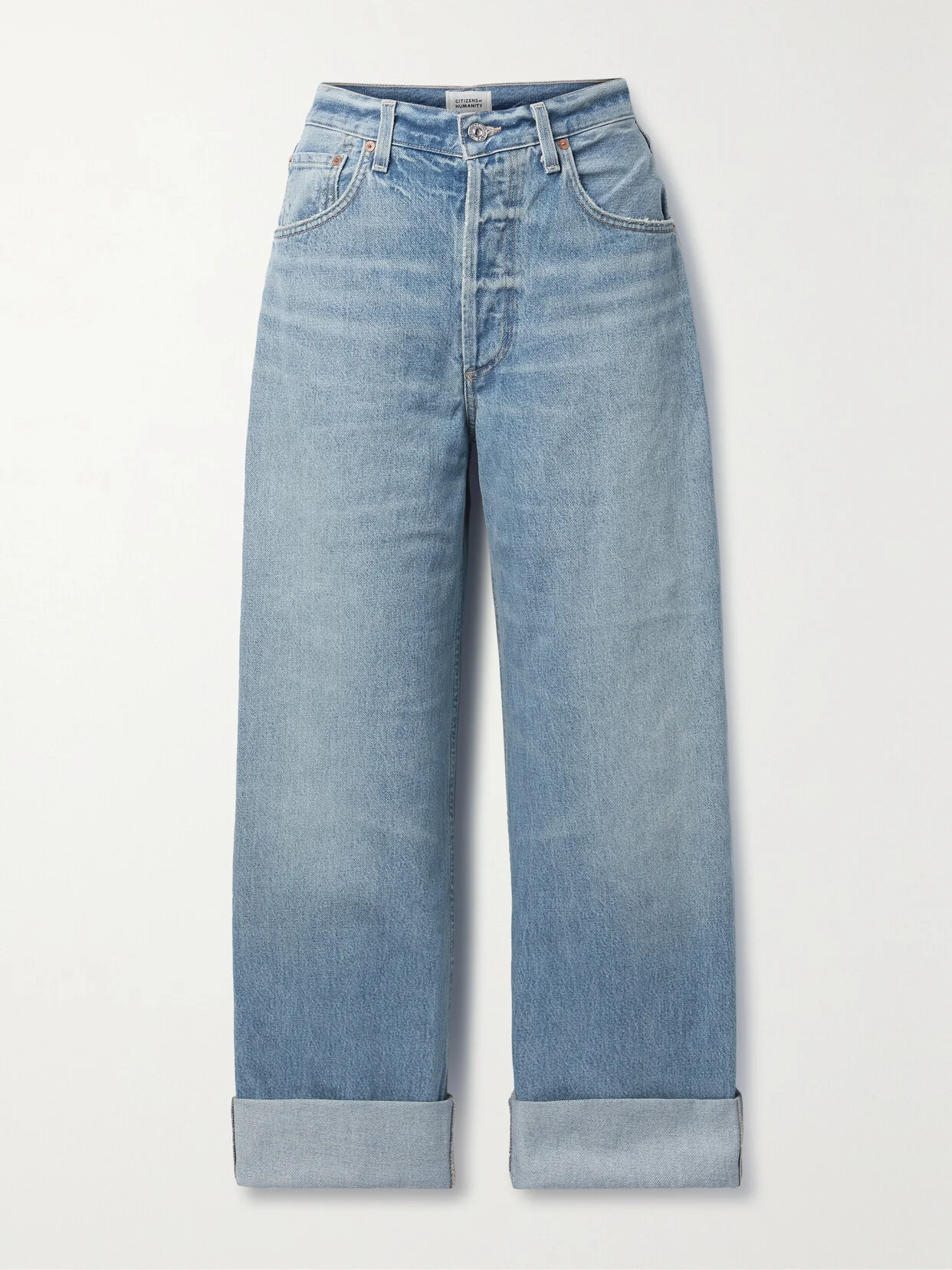 Citizens of Humanity's 'Ayla Baggy' jeans are made from faded and whiskered light-blue organic denim contrasted by gold topstitching. They're designed in a classic five-pocket construction and have a high-rise waist and wide legs that you can roll at the cuffs. This product was created using Considered Materials. Find out more about NET SUSTAIN here.