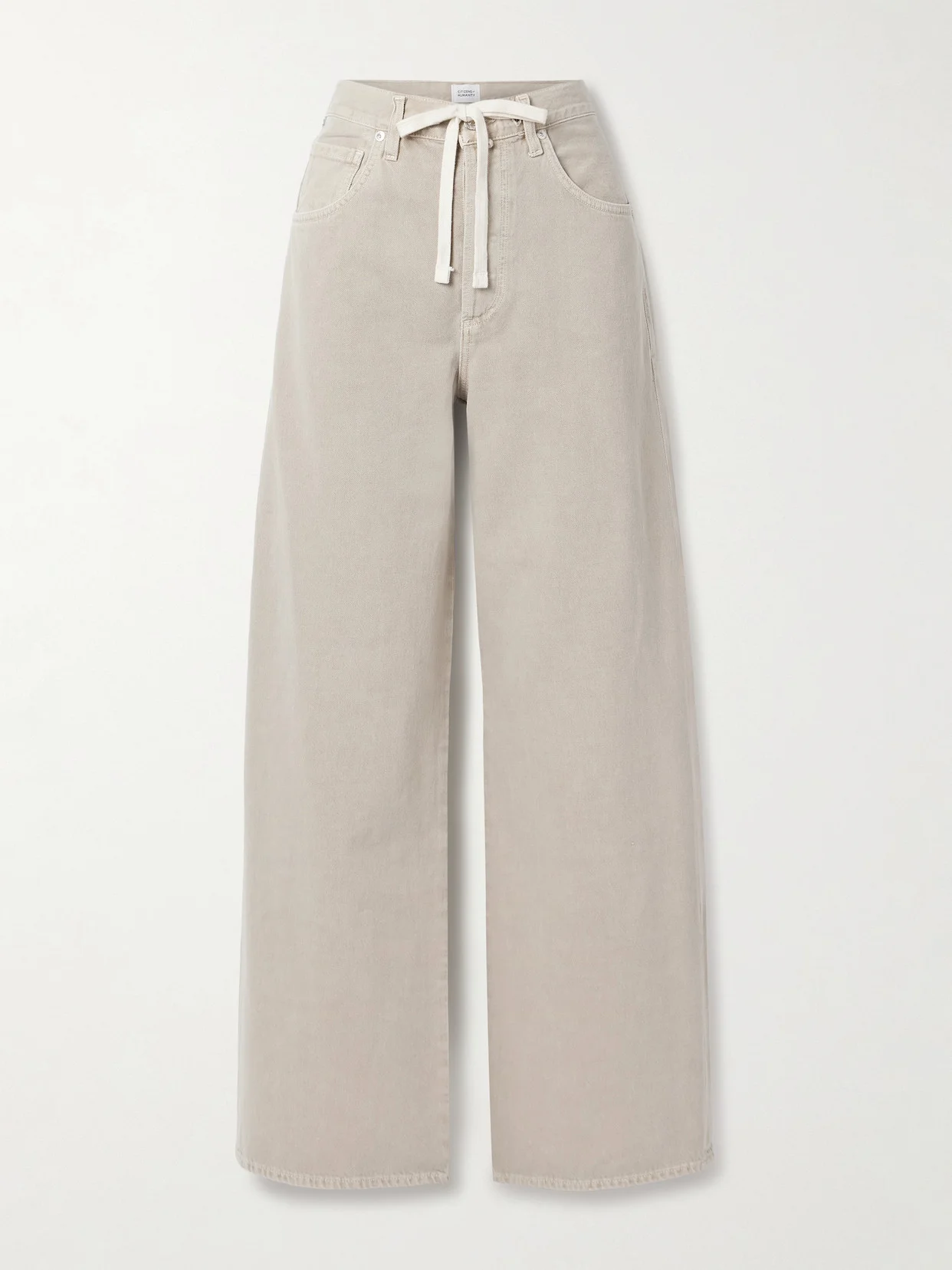 Citizens of Humanity's 'Brynn' jeans have a drawstring threaded through the mid-rise waist, so you can cinch them without the bulk of a leather belt. They're made from soft beige denim and have wide legs. Style yours with a simple white tee and sneakers. Lower-Impact Materials. This product is made using at least 50% lower-impact materials or ingredients. Find out more about our NET SUSTAIN criteria here.