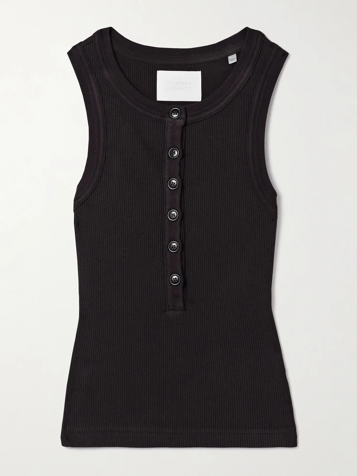 Citizens of Humanity's 'Caralyn' tank is made from jersey that's blended with plenty of organic cotton for softness. It's ribbed to accentuate the close fit and has a row of buttons along the placket, so you can customize the neckline. Lower-Impact Materials. This product is made using at least 50% lower-impact materials or ingredients. Find out more about our NET SUSTAIN criteria here.