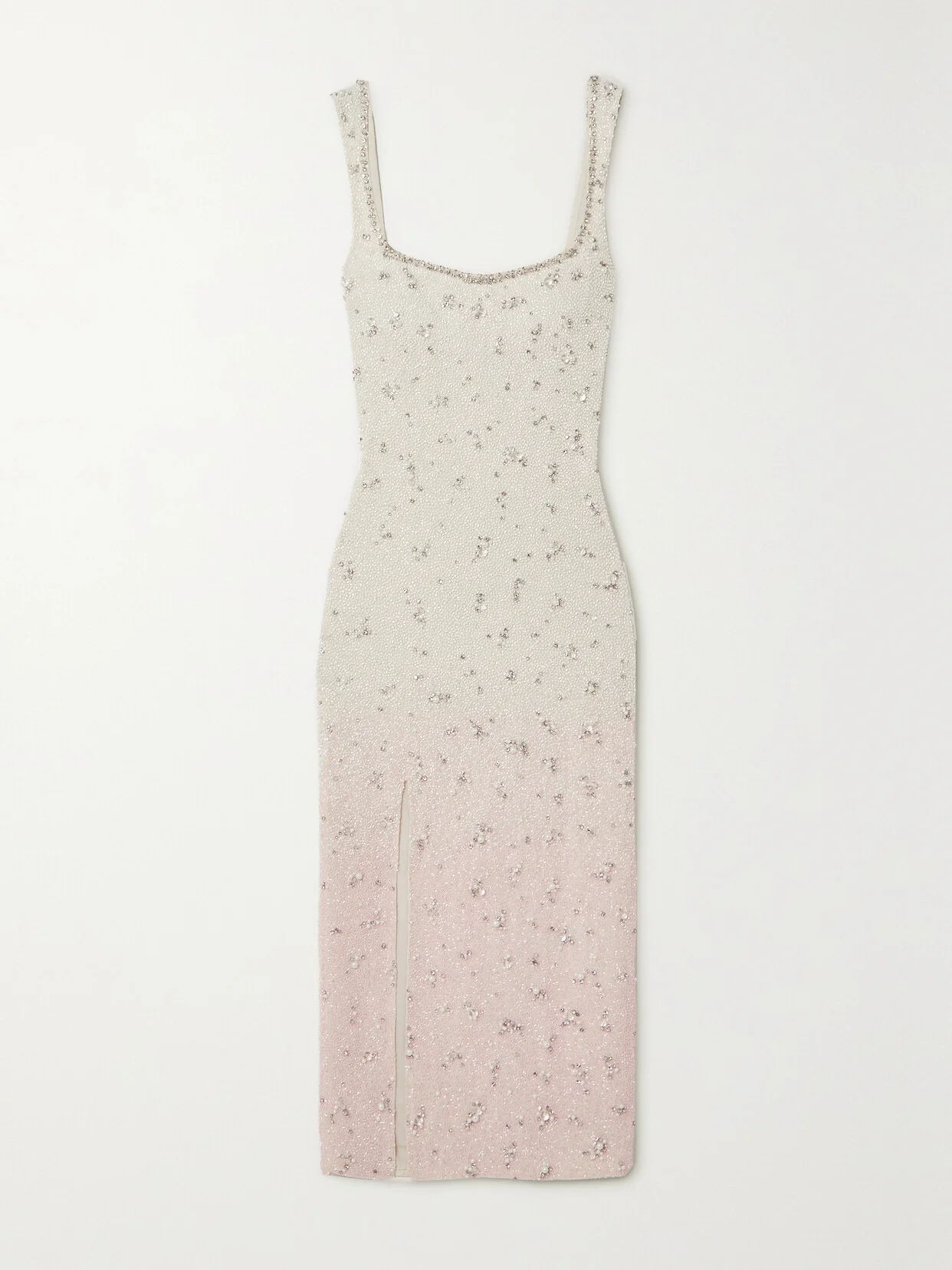 Clio Peppiatt's beautiful designs are all skilfully embroidered by hand - it's a thrill to see the designer's original drawings come to life. Fading from ivory to pastel-pink, this dress is cut from stretch-tulle and embellished with a masterful array of shimmering beads, crystals and pearls clustered to resemble tumbling petals. The sweetheart neckline is suitably romantic, so wear it on your wedding day or the surrounding celebrations with the brand's mini tote and heels.