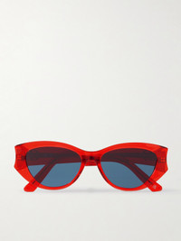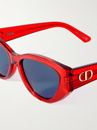Dior Eyewear's 'DiorGlow B1I' sunglasses are designed with cat-eye frames that are curved inversely at the temples. They've been made in Italy from striking red acetate and have blue lenses and gold-tone 'CD' logos at the arms.