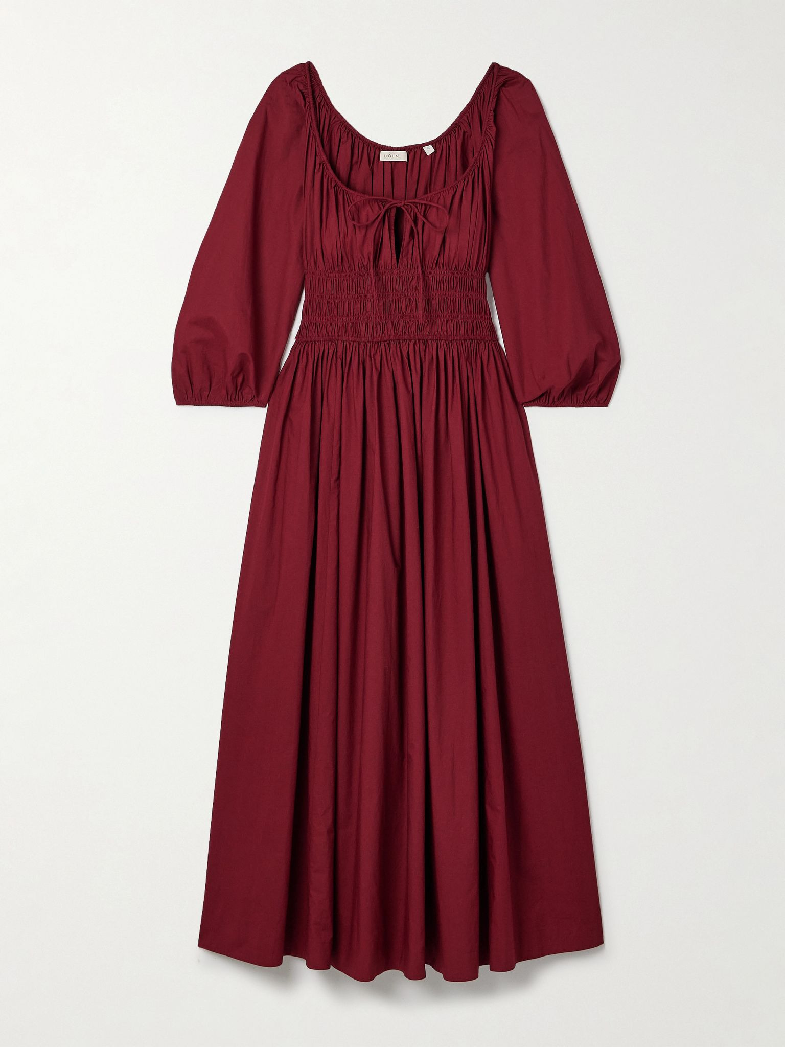 DOEN's 'Quintessa' dress is a long-sleeved re-imagining of the brand's signature 'Quinn' style. Cut from organic cotton-poplin, it has a flowy, relaxed shape cinched by shirring along the waistband. Style yours with sandals and sneakers alike. Size & Fit - Fits true to size, take your normal size - Designed to be fitted at the bust and waist, slightly loose at the hip - Elasticated at the neckline for a flexible fit - Partially elasticated at the bust and waist for a comfortable fit - Lightweight, slightly stretchy fabric - Model is 175cm/ 5'9" and is wearing a size Small Details & Care - Claret organic cotton-poplin - Slips on - 100% organic cotton - Unlined - Hand wash