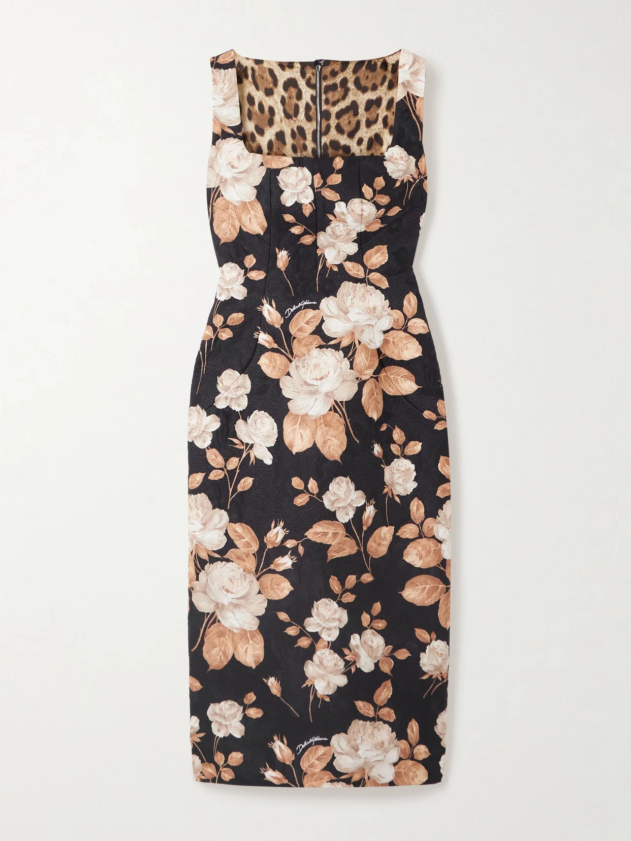 Vintage florals lend a sense of romance to Dolce & Gabbana's dress. Made from cotton-blend jacquard, it fits close through the darted bodice and has a chic column skirt. The bold leopard-print lining is a house signature.