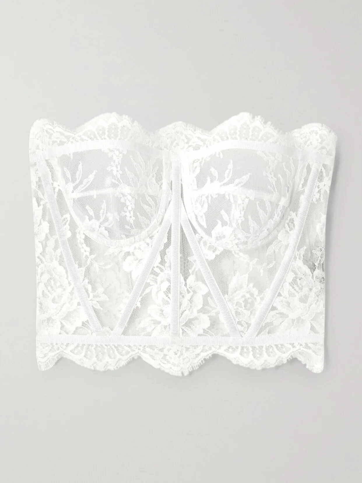Dolce & Gabbana's signature bustier top is reinvented in white lace and trimmed with grosgrain. The boning provides corset-style structure. Wear it with a blazer or on its own with high-rise pants.