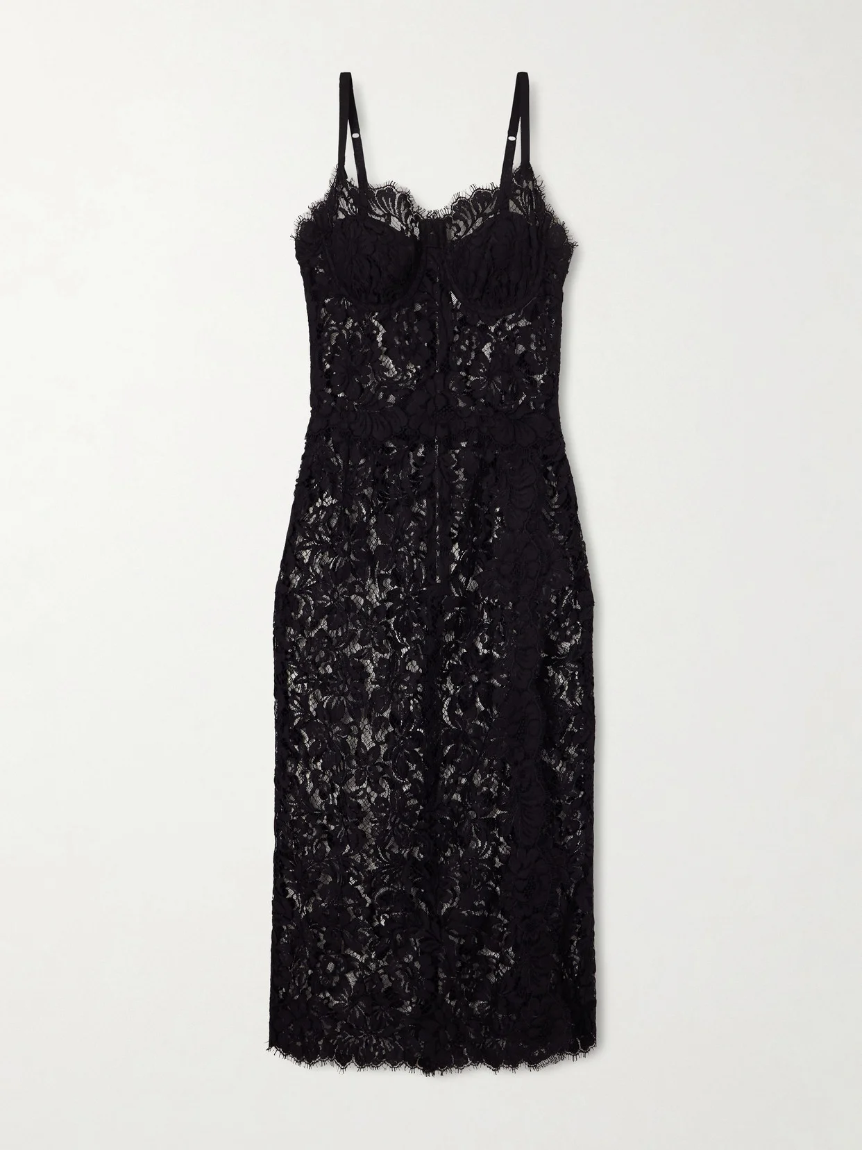 Dolce & Gabbana's Spring '26 collection is shaped by the sensual yet playful charm of Sicily. This romantic midi dress is constructed from floral lace, with a corset-inspired bodice and elegant pencil skirt. Large to size. See Size & Fit notes.