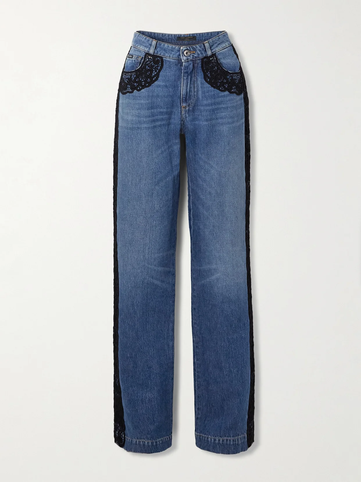 Dolce & Gabbana adds its signature romantic detailing to these jeans, making them an elevated take on a wardrobe staple. Traced with scalloped black lace, they're cut from faded denim and have a mid rise and straight legs. Don't miss the silver-tone logo hardware at the back pocket.